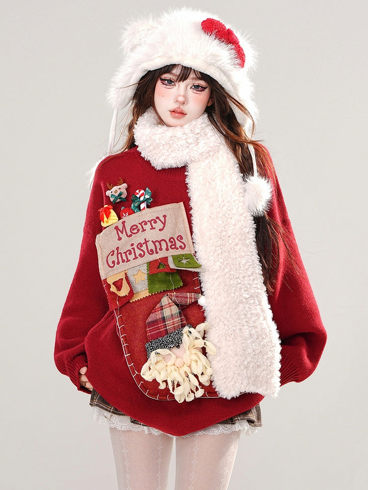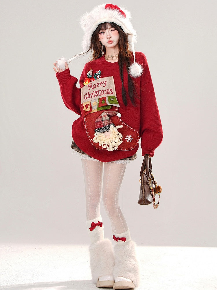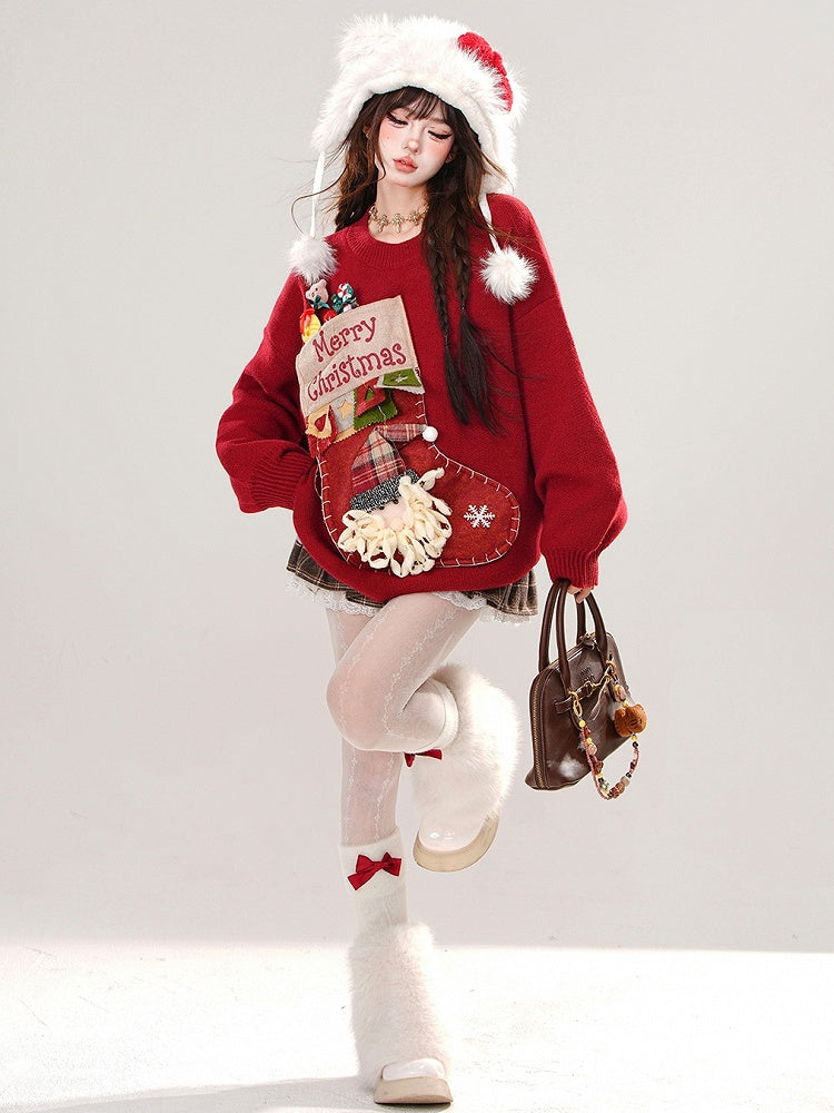 赤いクリスマスストッキングのラウンドネックルーズセーター
