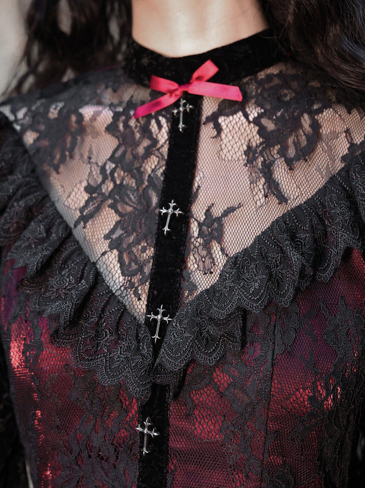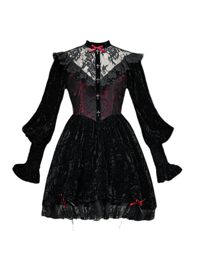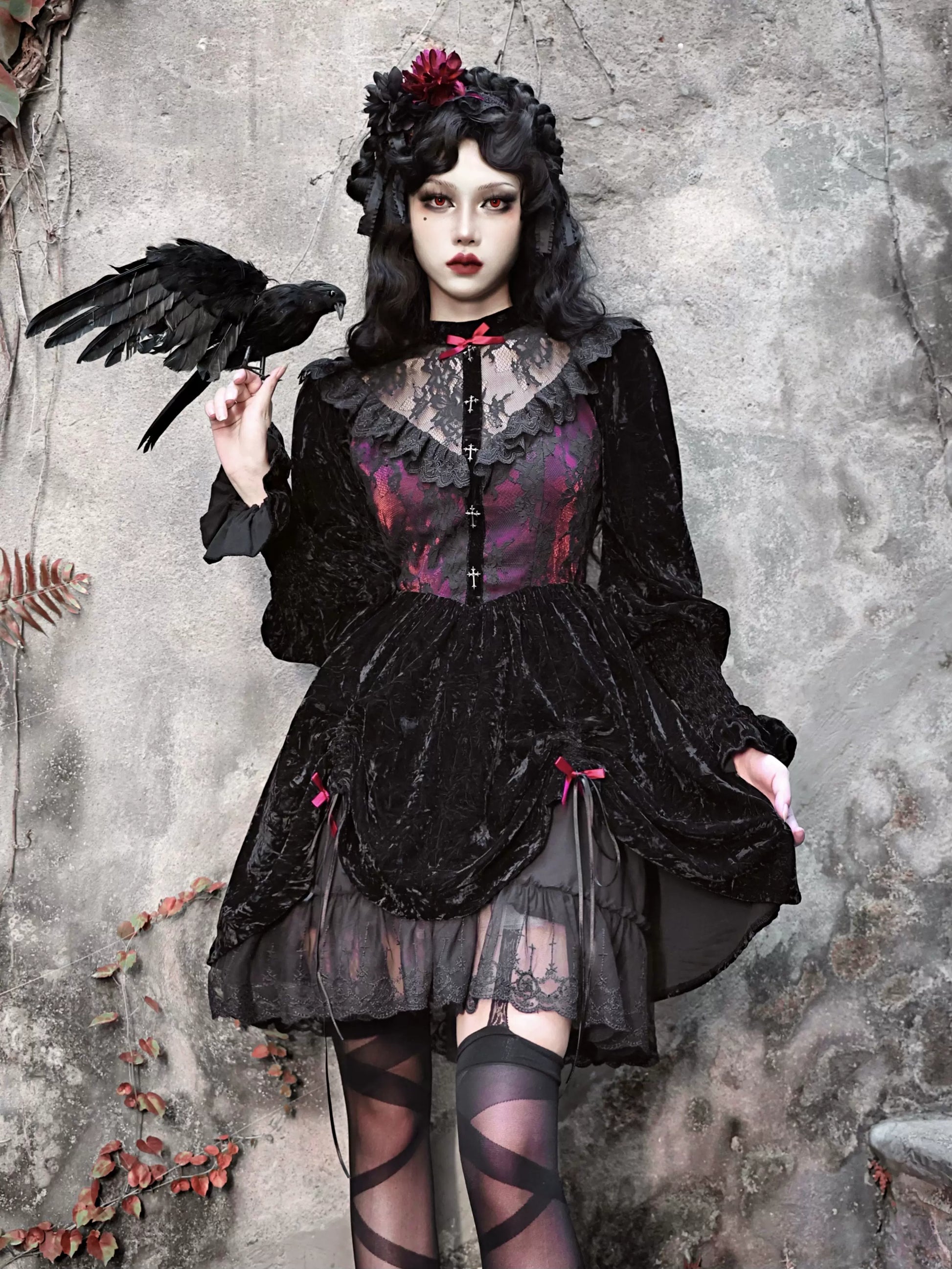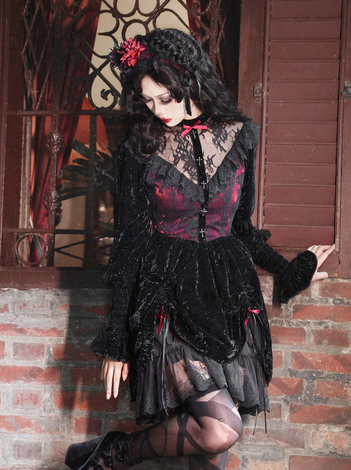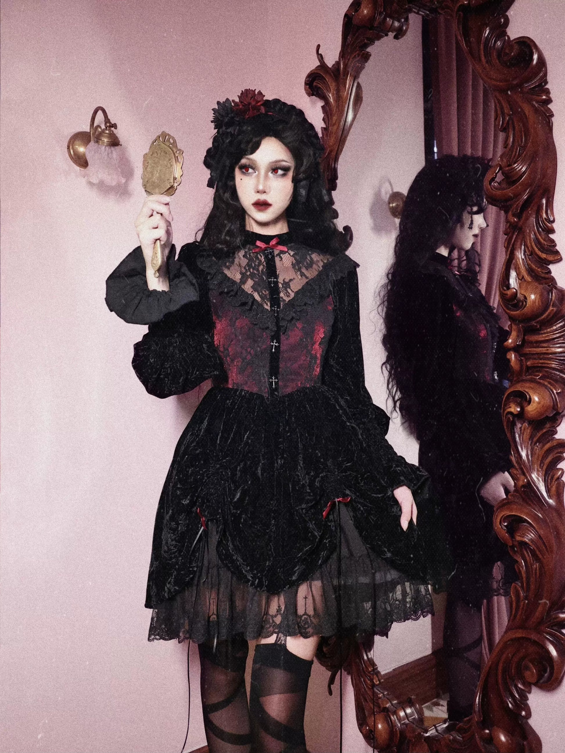この愛らしい赤いドレスは、美しいパフスリーブ、柔らかなベルベット生地、繊細なローズレースのディテール、そしてゴシックでダークな雰囲気が特徴です。墓地へのお出かけにぴったりです。