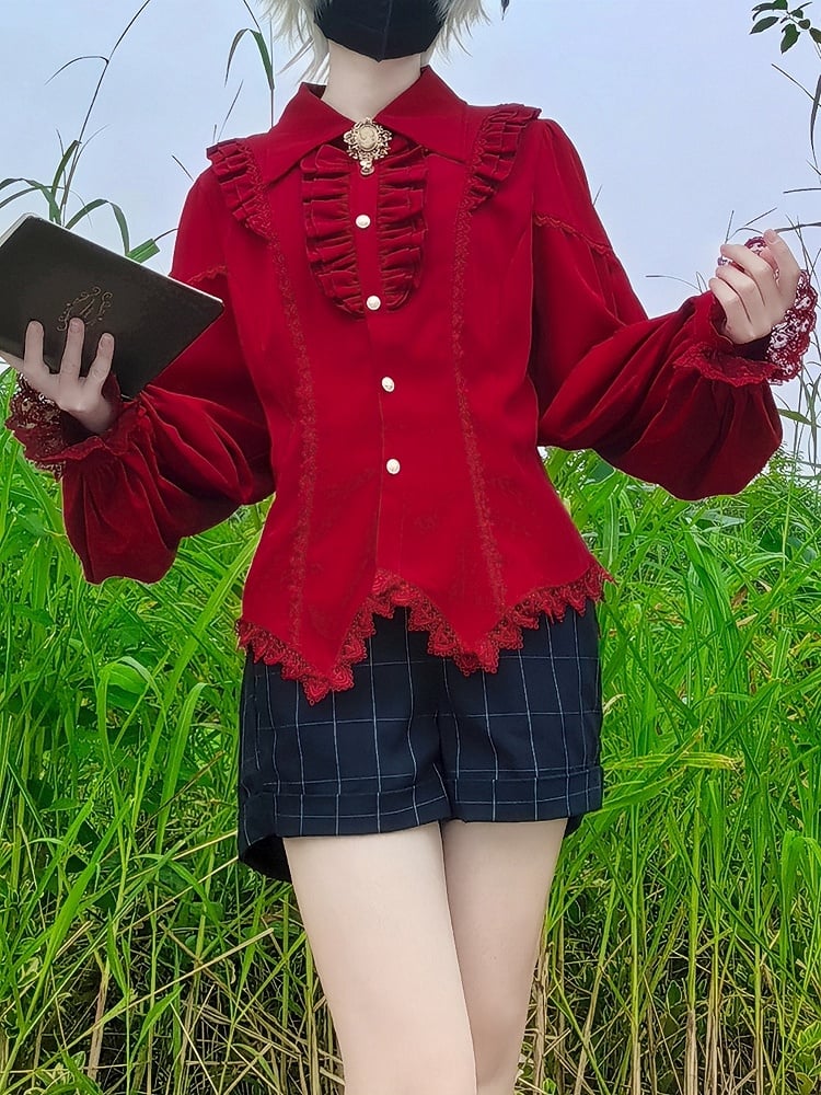 エレガントなレッドのポインテッドカラー長袖シャツ