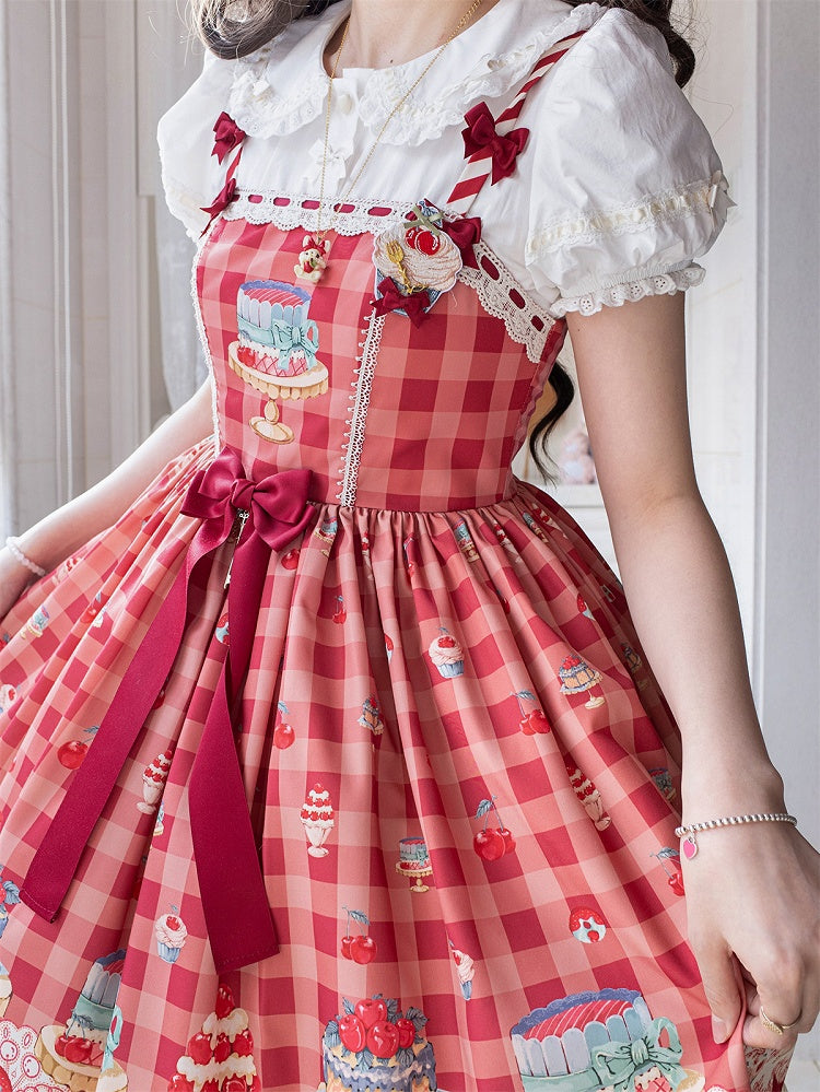 レッドギンガムチェックとチェリー&デザートのスイートロリータジャンパースカートで、あなたの愛らしさをワンランクアップさせましょう。キュートでスイートなものが大好きなあなたにぴったりのこのジャンパースカートは、チャーミングなレッドギンガムチェックと、キュートなチェリーとデザートのアクセントが特徴です。着るたびに、幸せと喜びが広がります!
