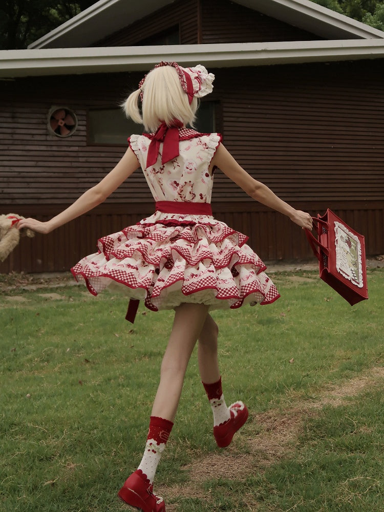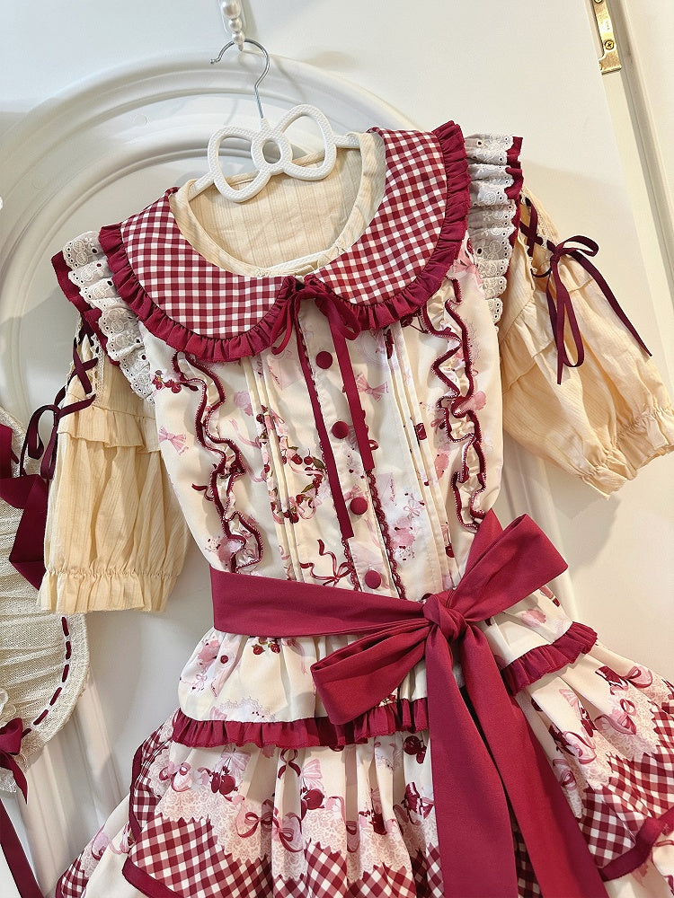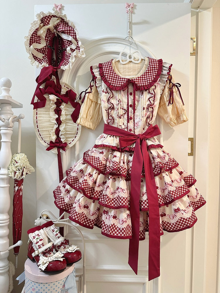 レッドギンガムチェックのピーターパンカラートップスとチェリー柄のティアードスカートセット
