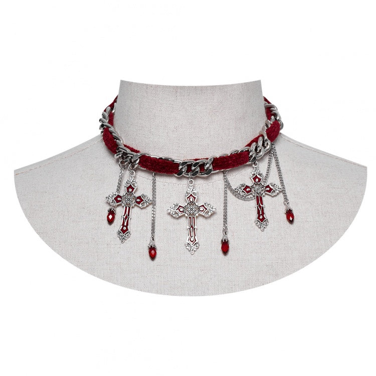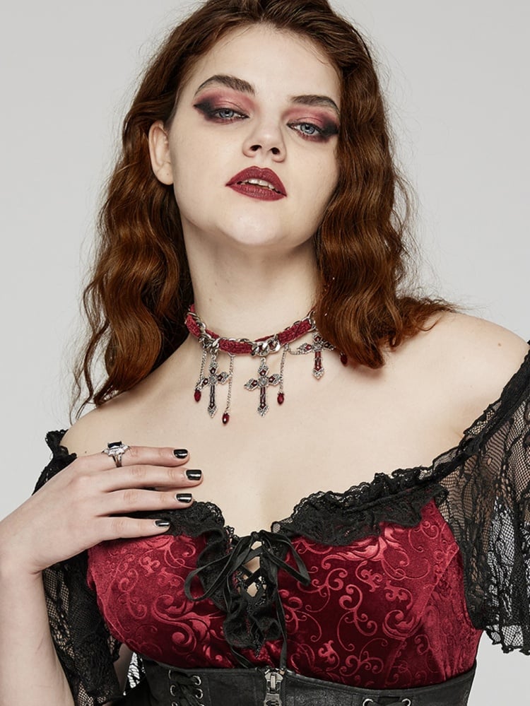 レッドゴスゴージャスクロスチョーカーで、エッジの効いた魅力をあなたのスタイルにプラス。印象的なデザインと大胆なレッドカラーが、どんな装いも格上げし、あなたを力強くスタイリッシュな個性へと導きます。ゴシックなワードローブにキュートなアクセントを添えるのに最適です。