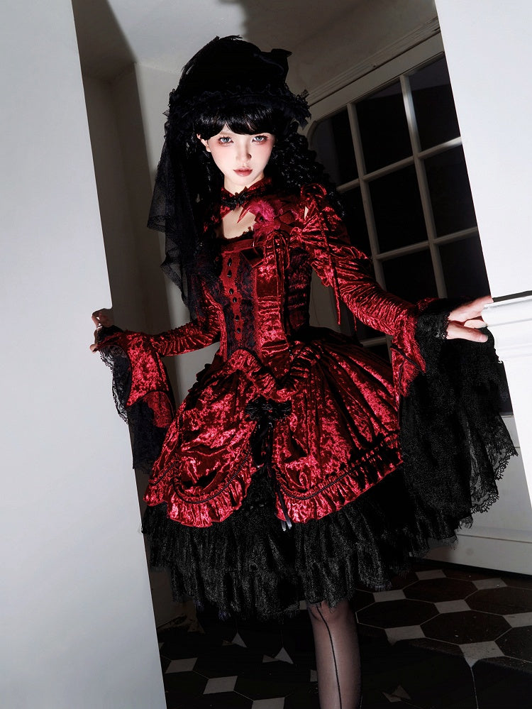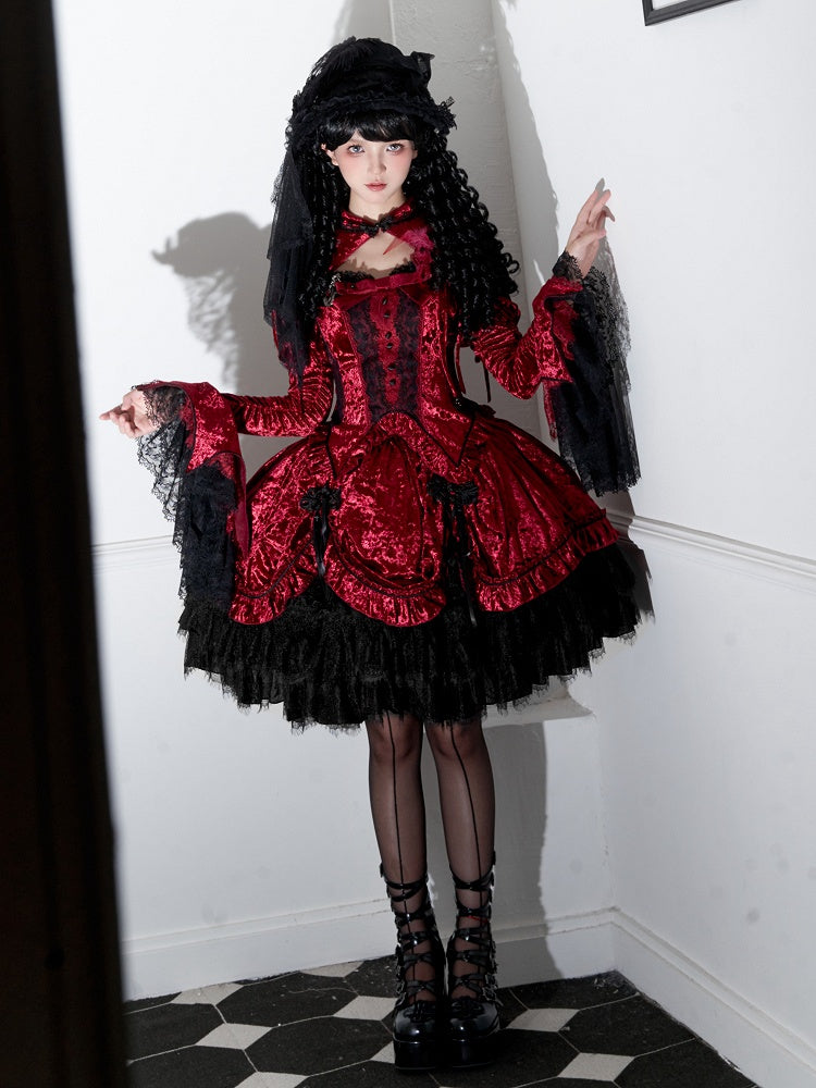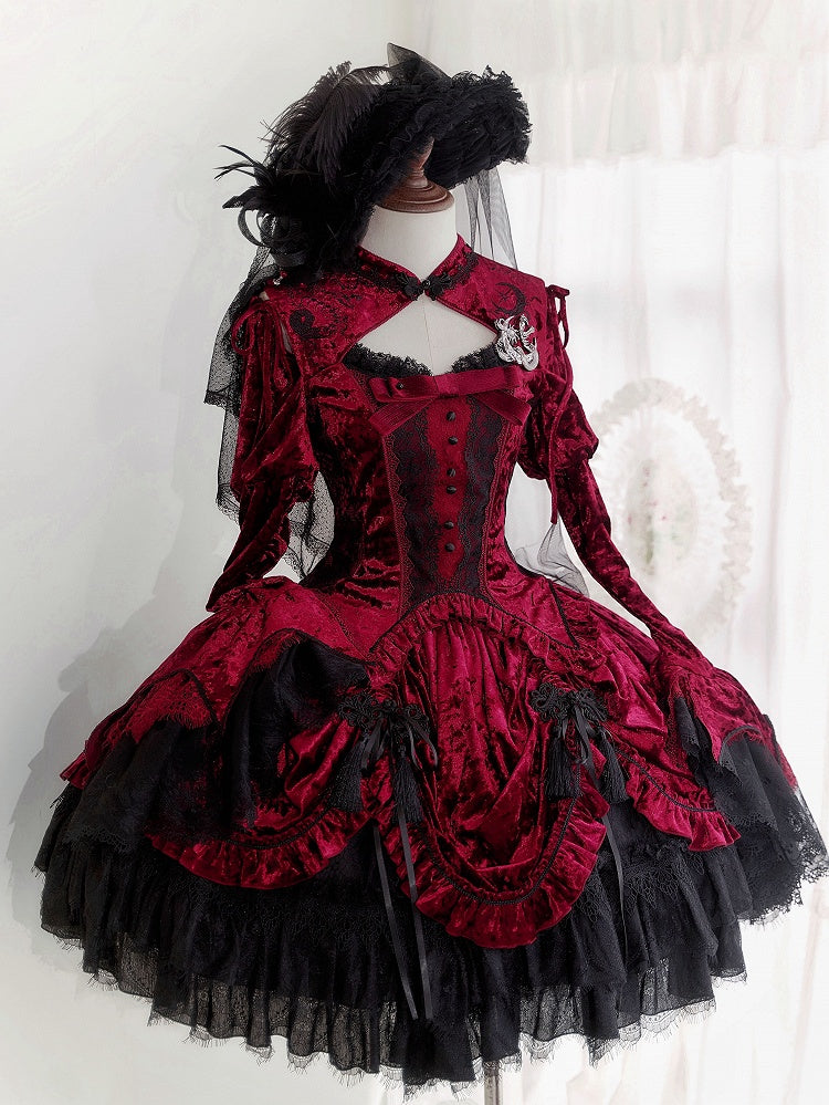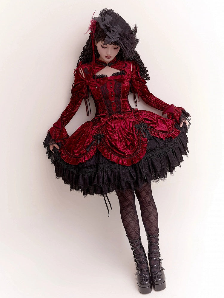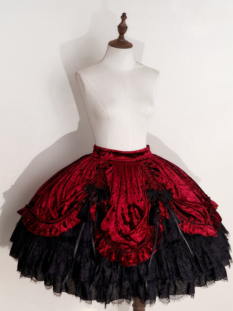 赤いゴシックロリータベルベットタッセルノットボタンドローストリングスカート