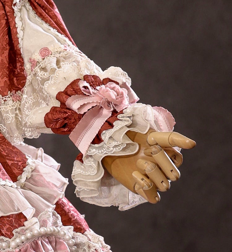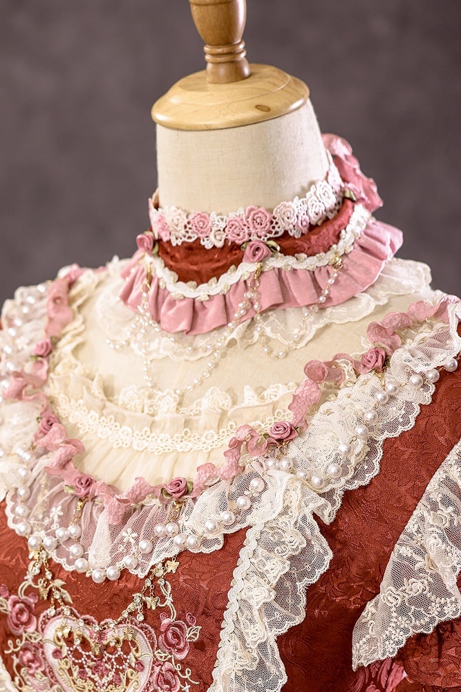 赤い花嫁ロゼット刺繍の花とビーズチェーンのディテールロリータOPフルセット