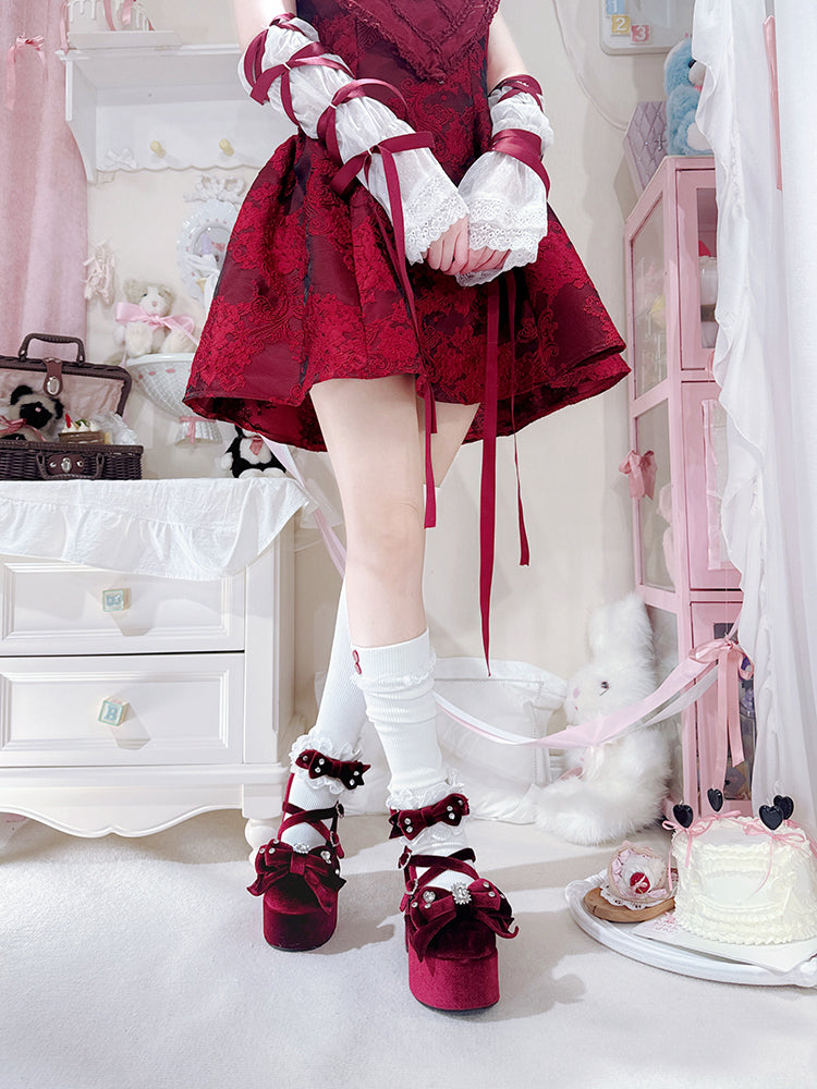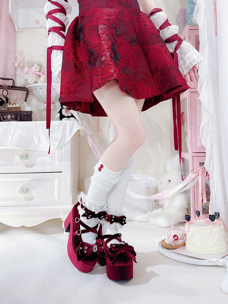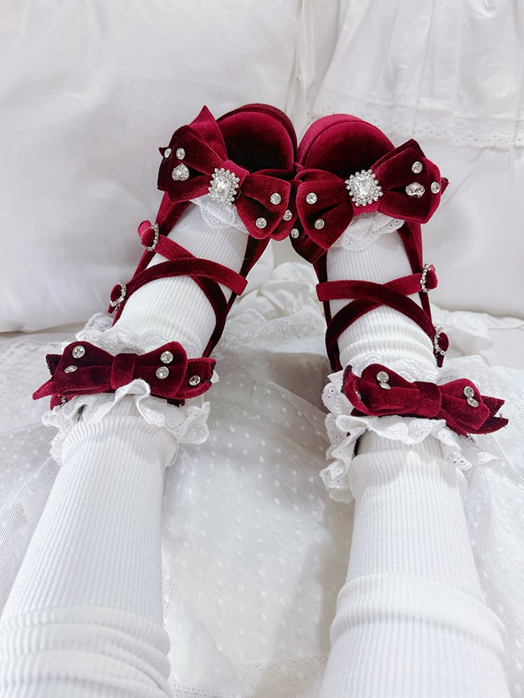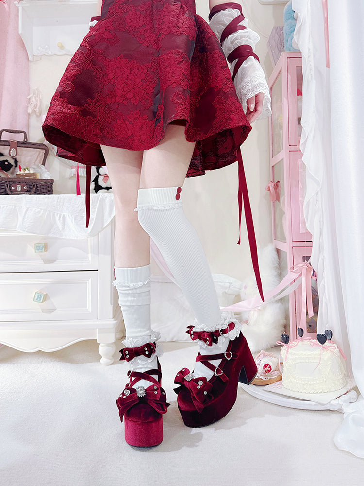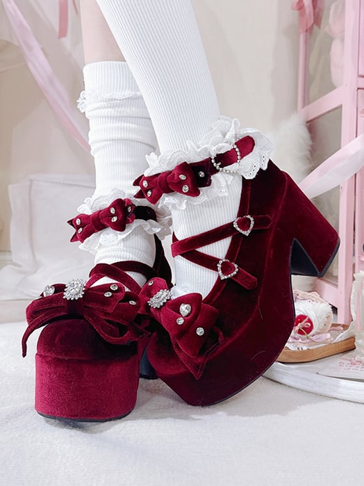 ワインレッドのリボンアクセント、ジライケイ ハイブロックヒール、ベルベットのオールドスクールロリータメリージェーン