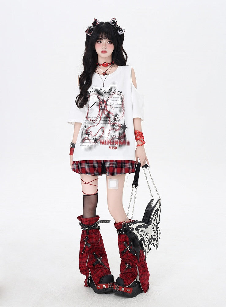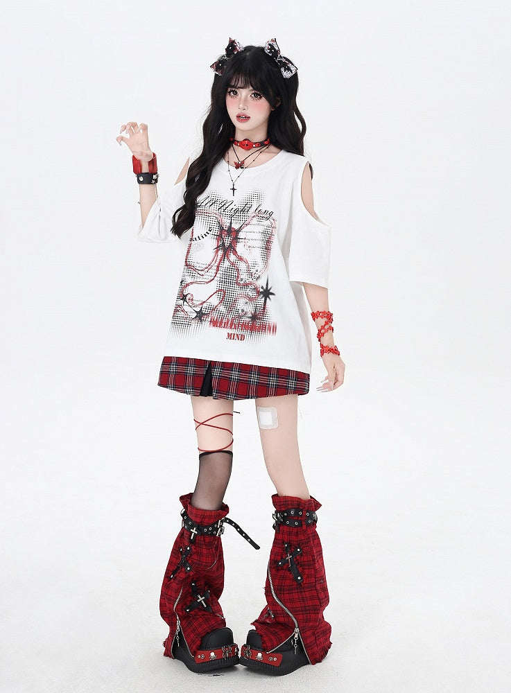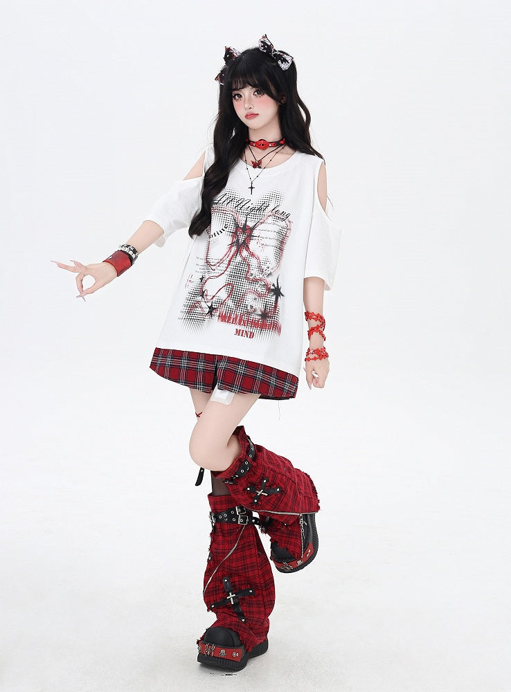 レッドチェックの裾、ホワイトのラウンドネック、カットアウトショルダー、グラフィックTシャツ