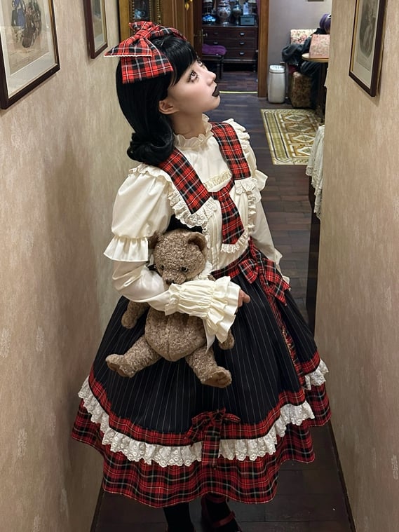 赤いチェック柄と黒いストライプ柄のドレス、取り外し可能な襟とネクタイ付きロリータジャンパースカート
