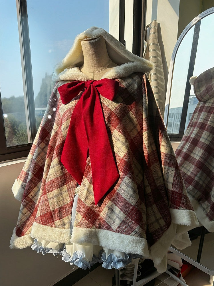 赤いチェック柄のセルフタイ、大きなリボンネックライン、クリスマスフード付きケープコート