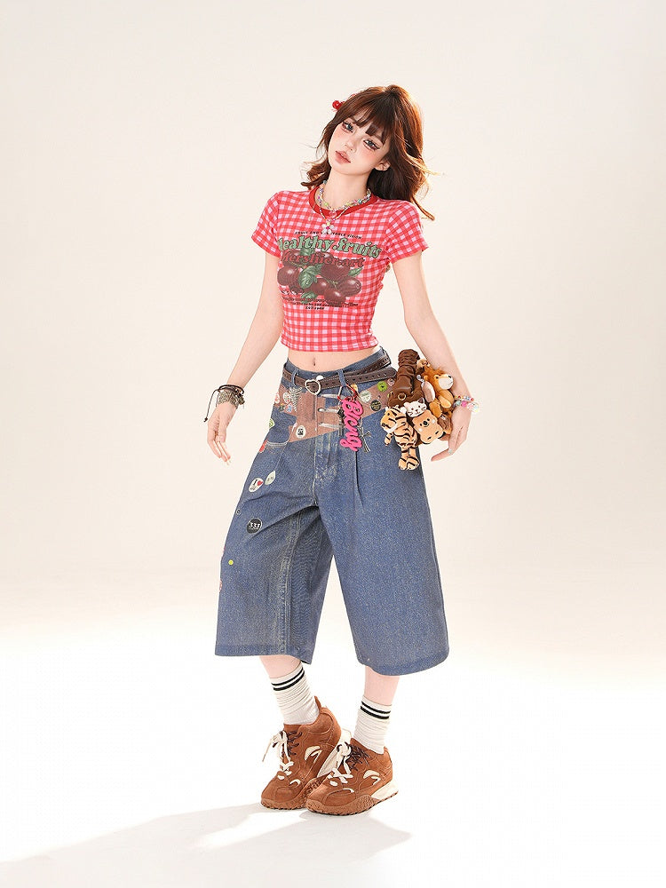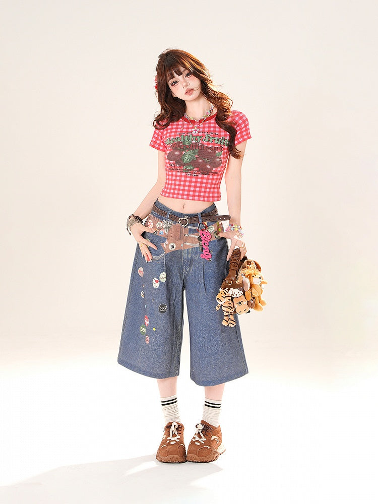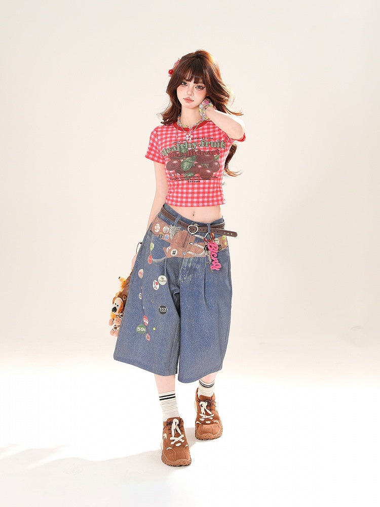 レッドチェック柄ラウンドネックフルーツプリントクロップドTシャツ