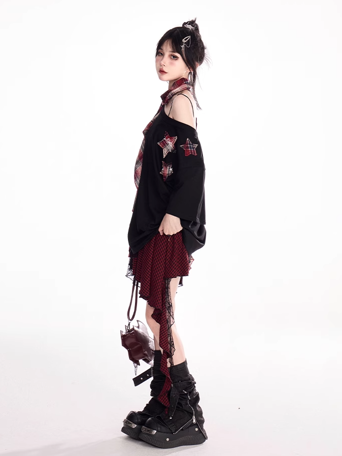 レッドチェック柄スターアップリケ付きブラックアシンメトリーネックラインTシャツ