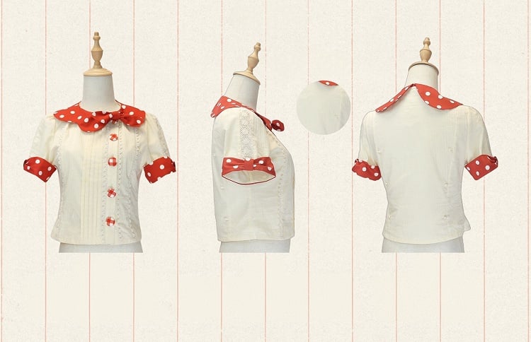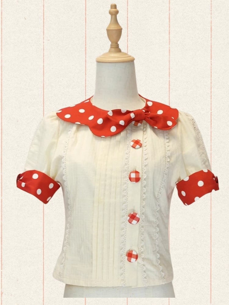 赤い水玉模様の襟と袖口、クリーム色の半袖ブラウス