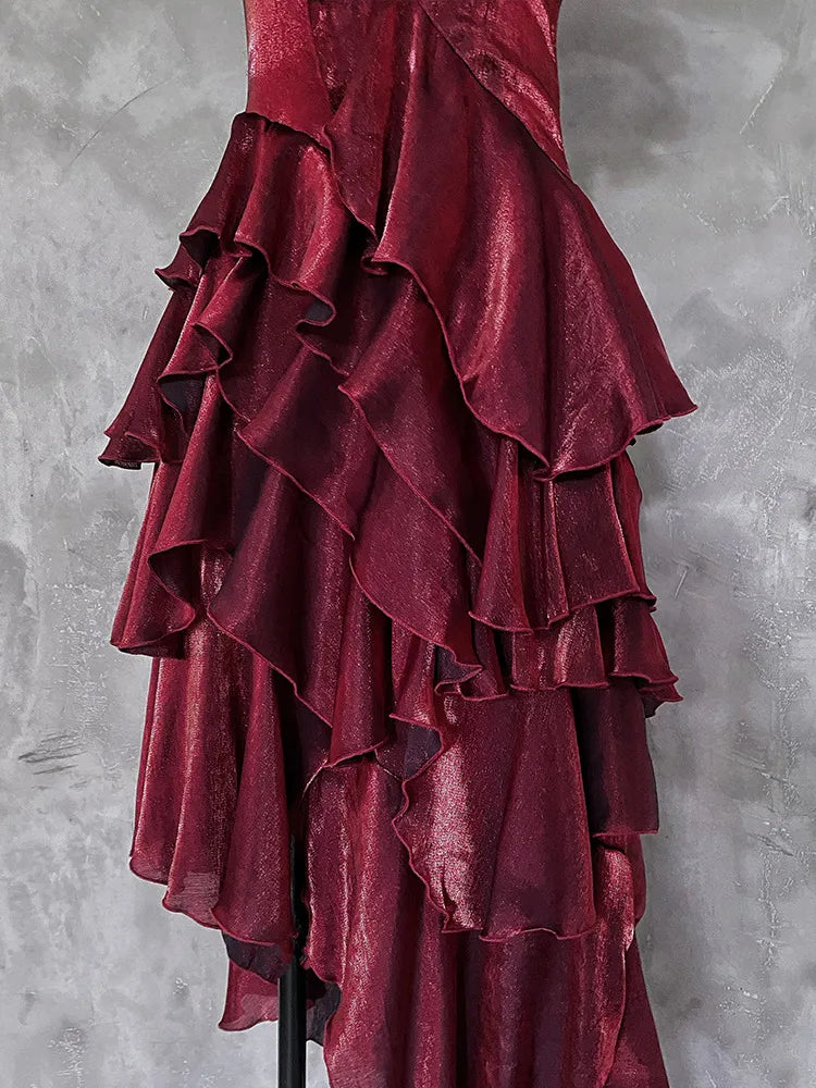 この素敵なレッドシマープロムドレスで、輝きを放ちましょう!アシンメトリーなレイヤードフリルデザインが、このエレガントなドレスにキュートな雰囲気を添えています。スパゲッティストラップが美しいシルエットを演出し、どんな特別な日にもぴったりです。このゴージャスでスタイリッシュなドレスで、周りの視線を釘付けにしましょう。