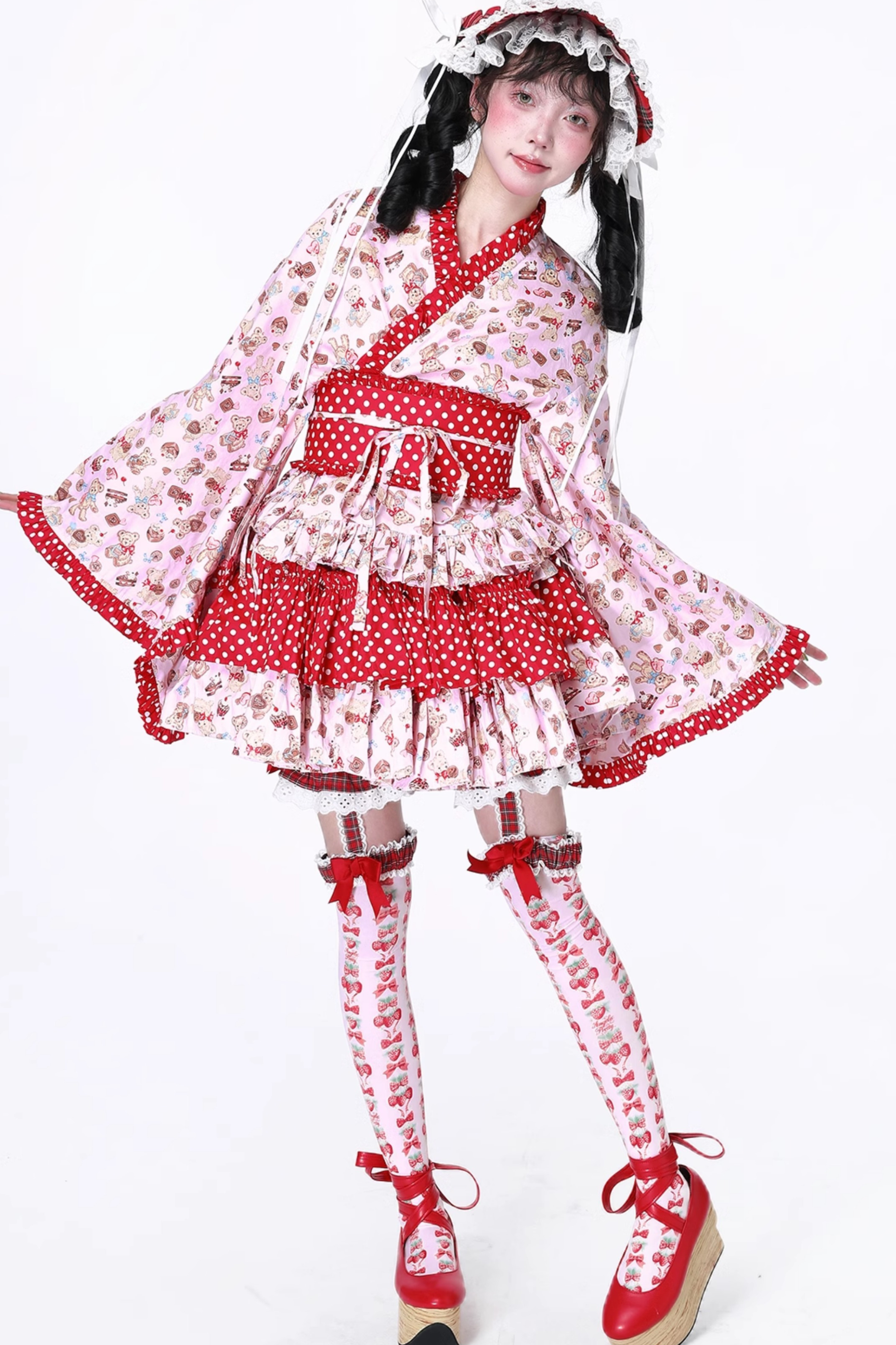 ピンクと白のオールドスクールロリータファッションドレス、蝶結びディテール、ロリータJSKセット