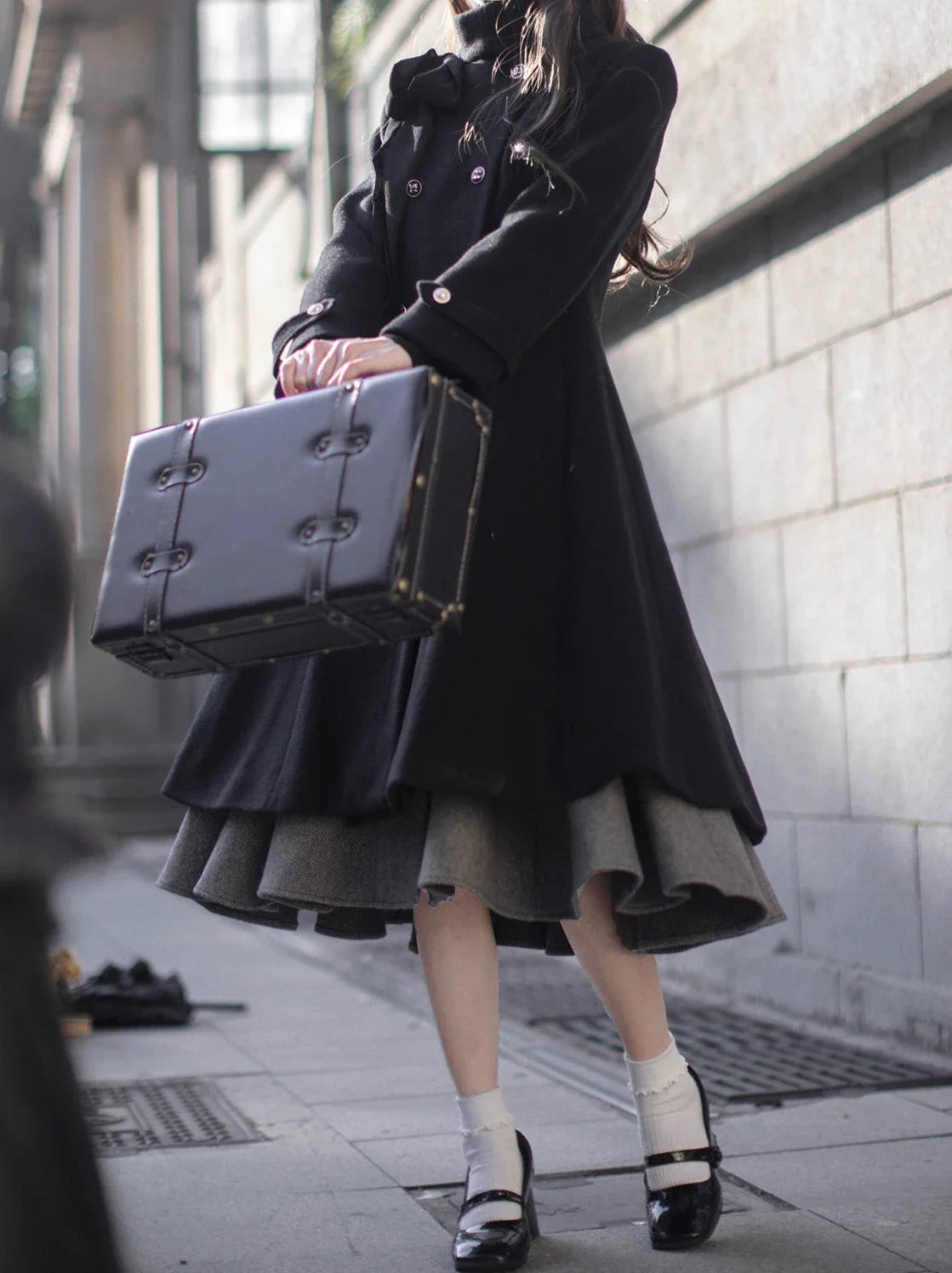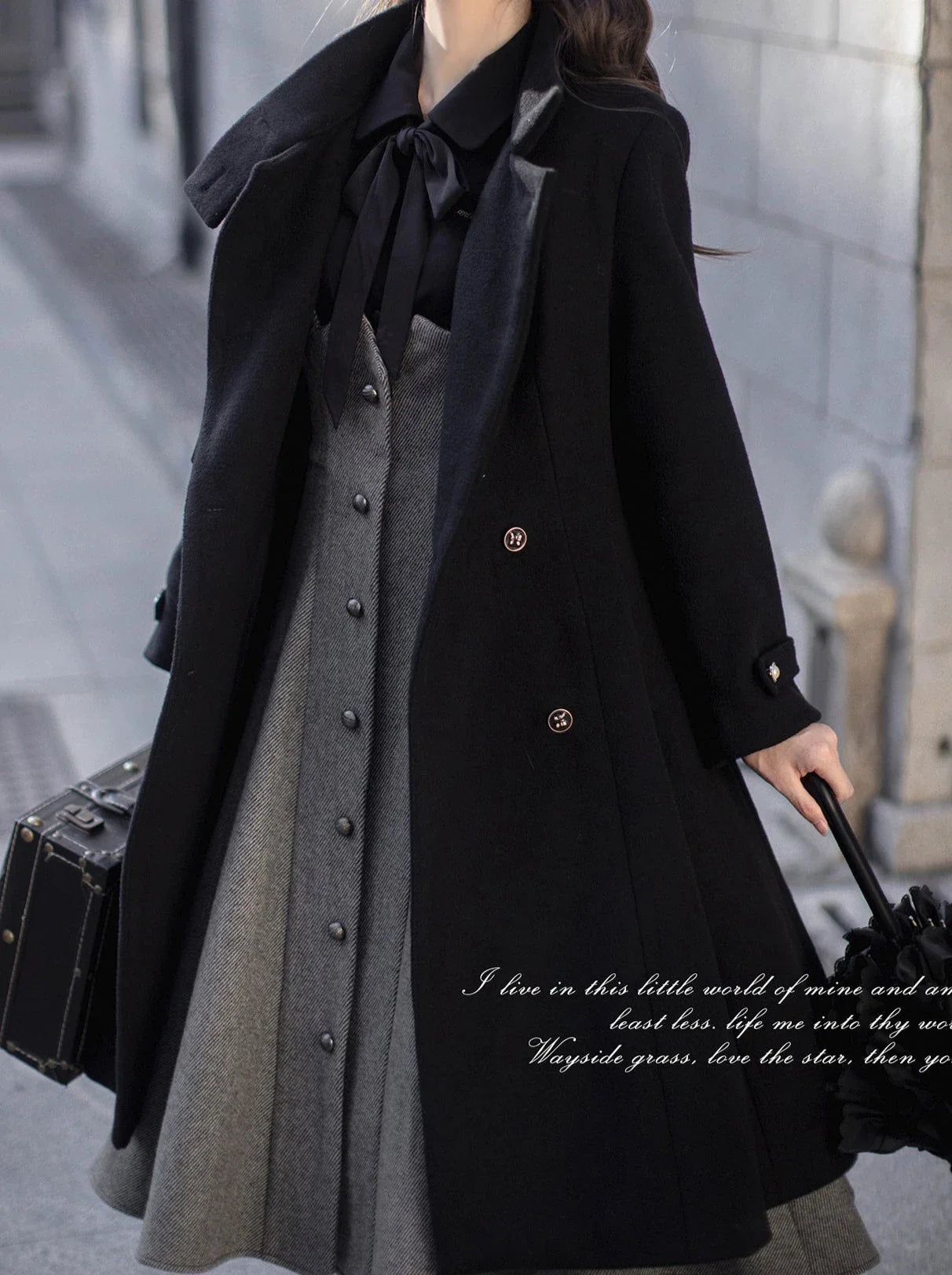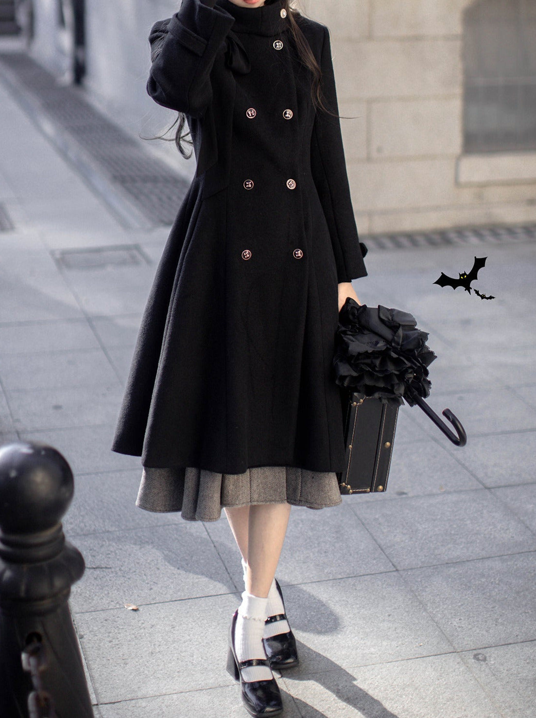 レトロなウールのダブルカラー+エレガントなブレストリボンコートスタンド