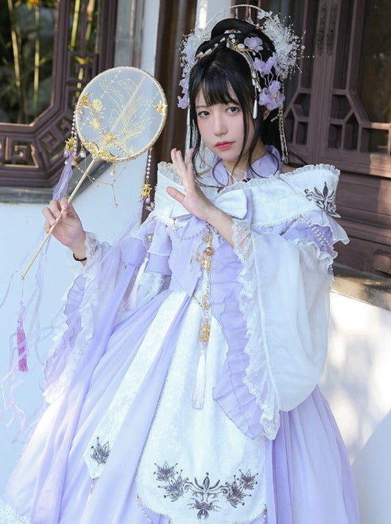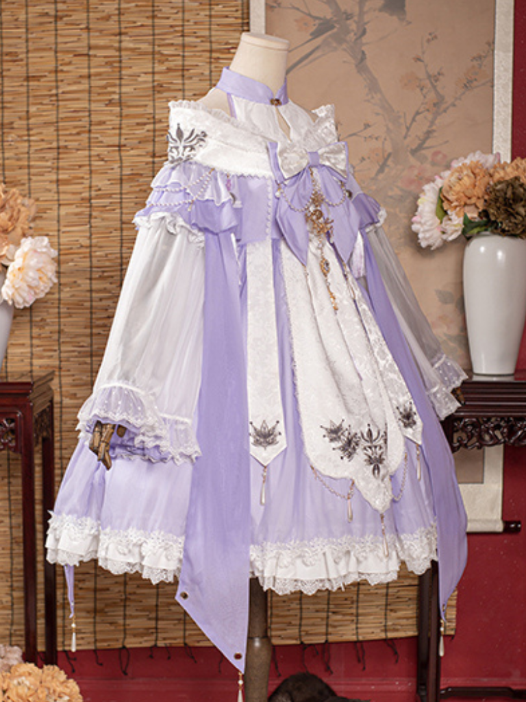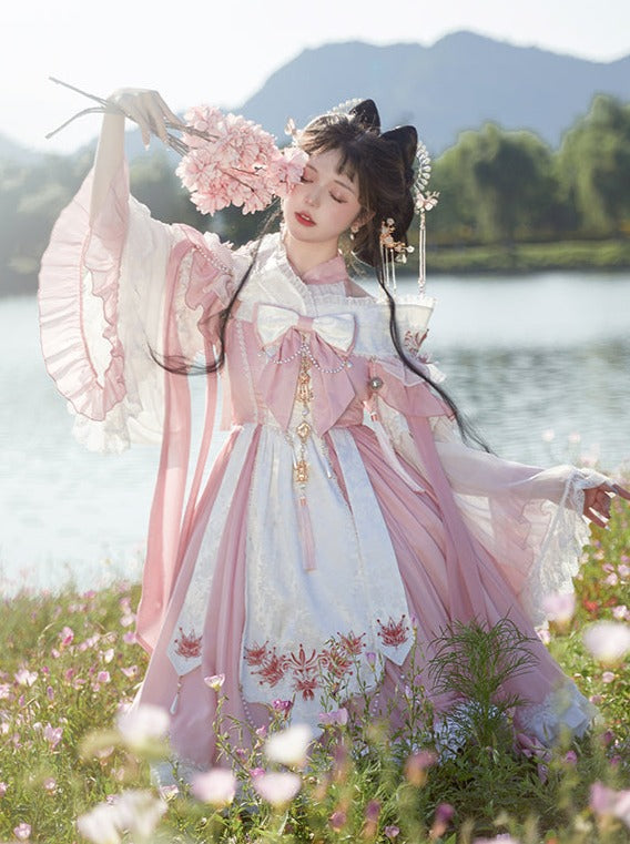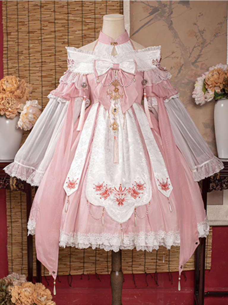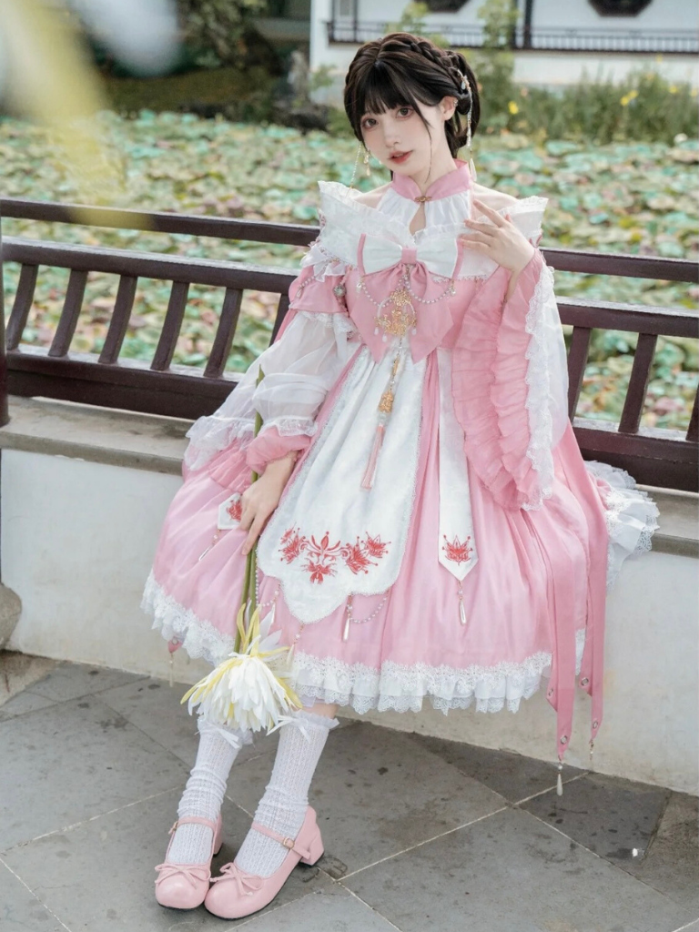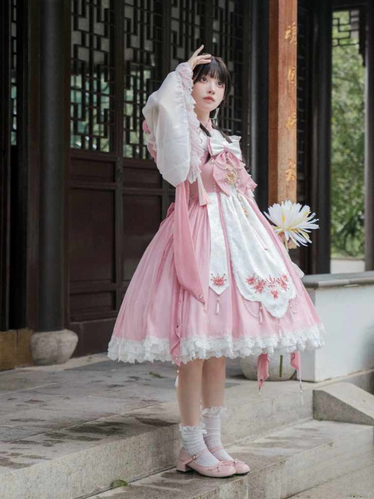 リボンのアクセントとサスペンダーデザインが特徴の、甘さ控えめなロリータドレス。キュートでチャーミングな装いにぴったりです。中国風の要素を取り入れたデザインで、お茶会などの楽しいシーンにぴったりのドレスになること間違いなしです。