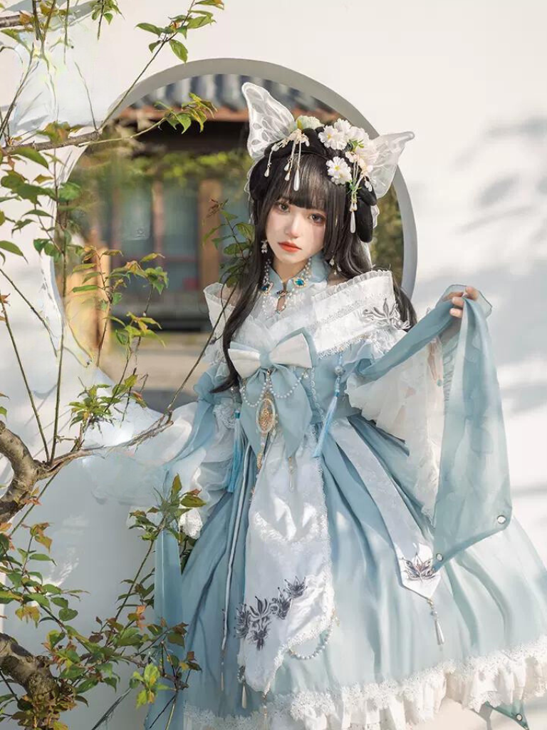 青と白のオールドスクールロリータファッションドレス 蝶結びディテール JSK セット