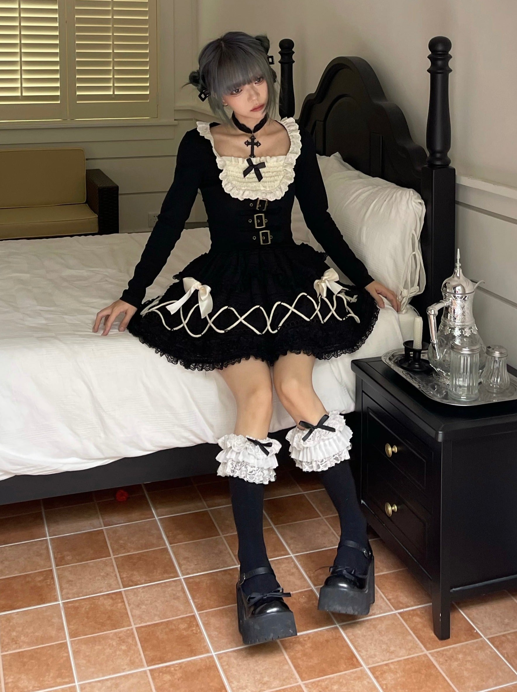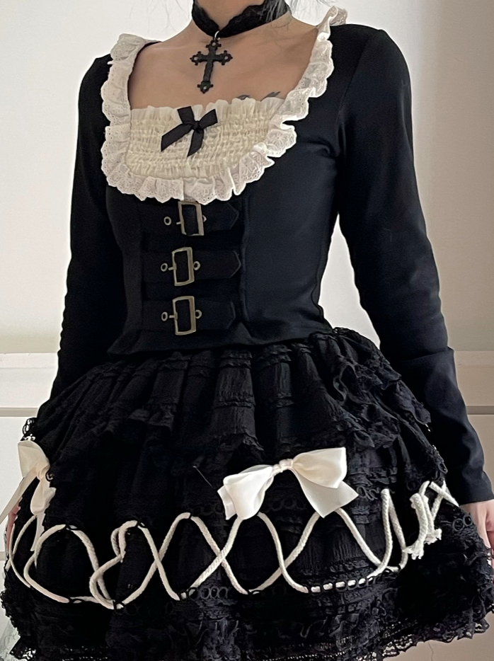 黒と白のオールドスクールロリータファッションドレス蝶結びロリータJSKセット
