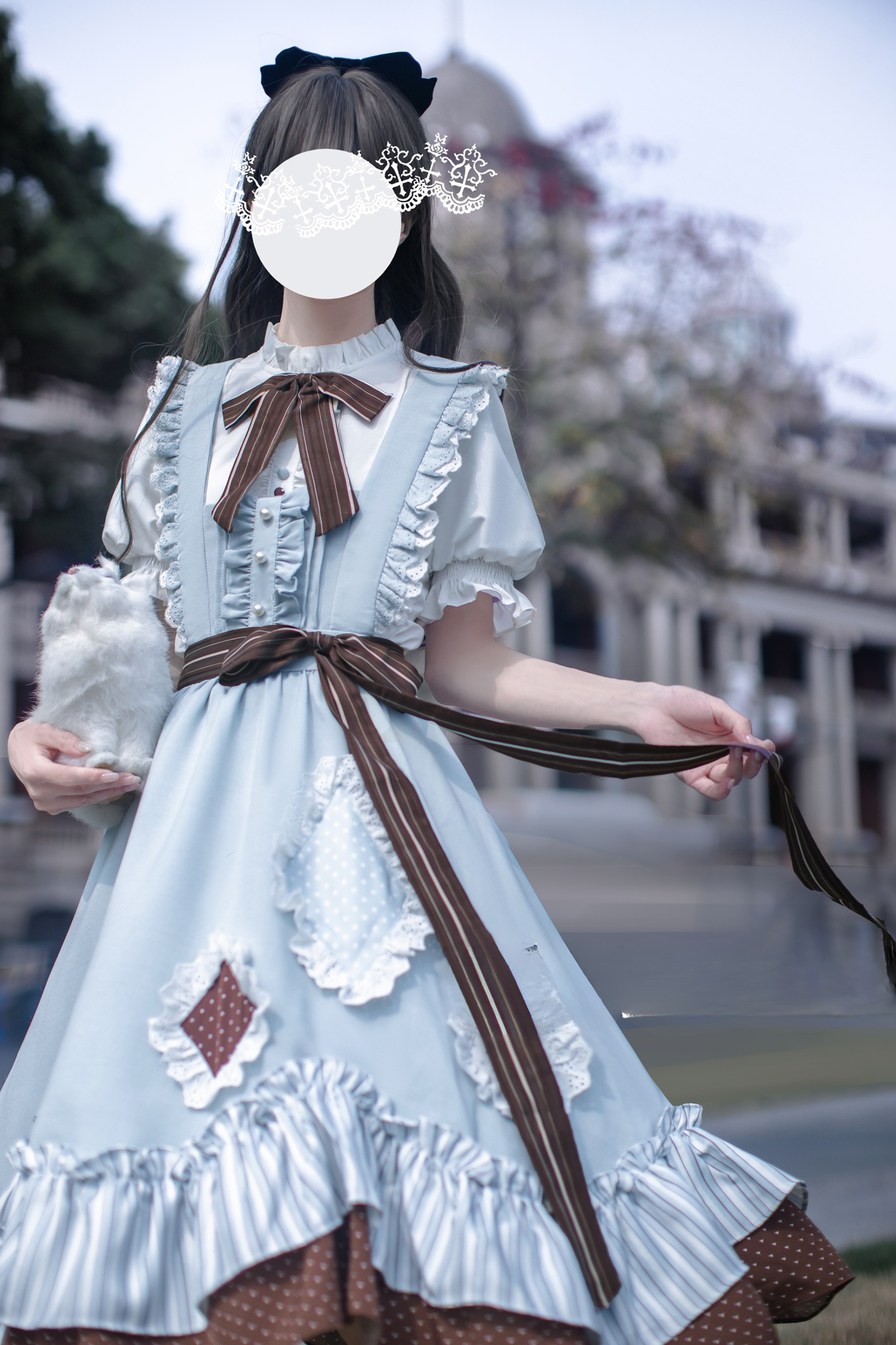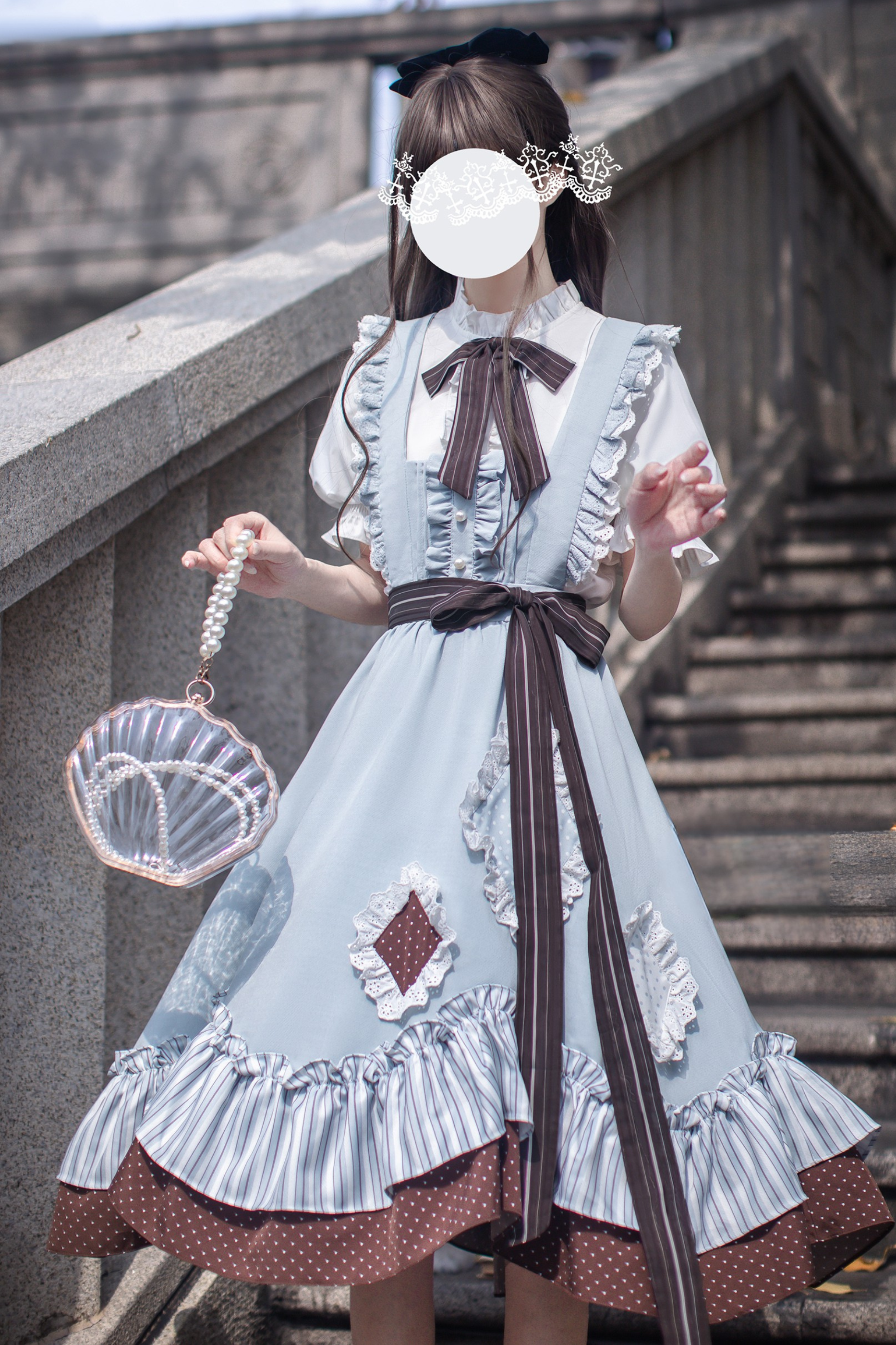 青と白のオールドスクールロリータファッションドレス 蝶結びディテール JSK セット