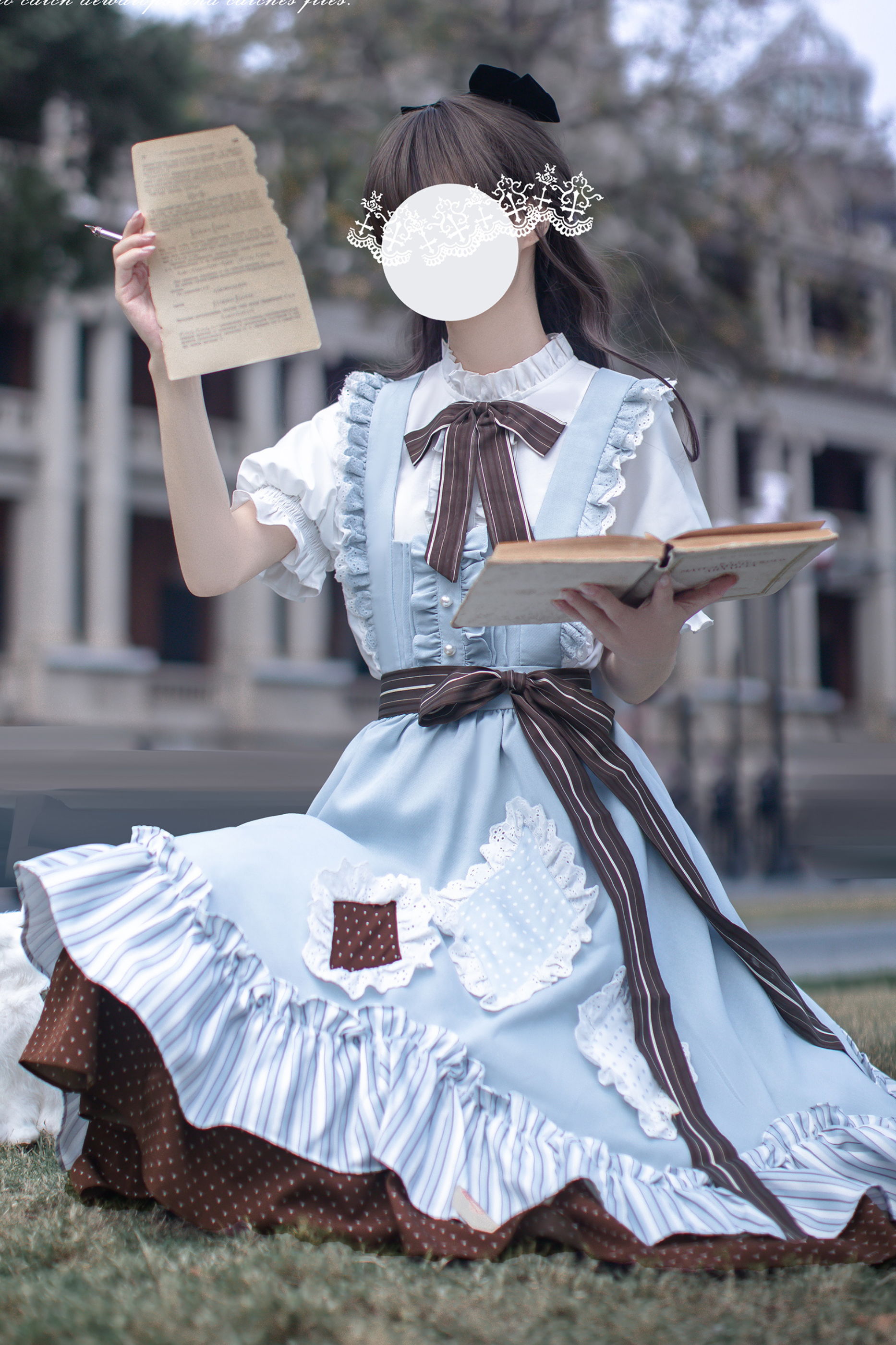 ❤レトロなアリス風サスペンダースカート + シャツ + リボンタイ + ブローチ + ヘアクリップ❤