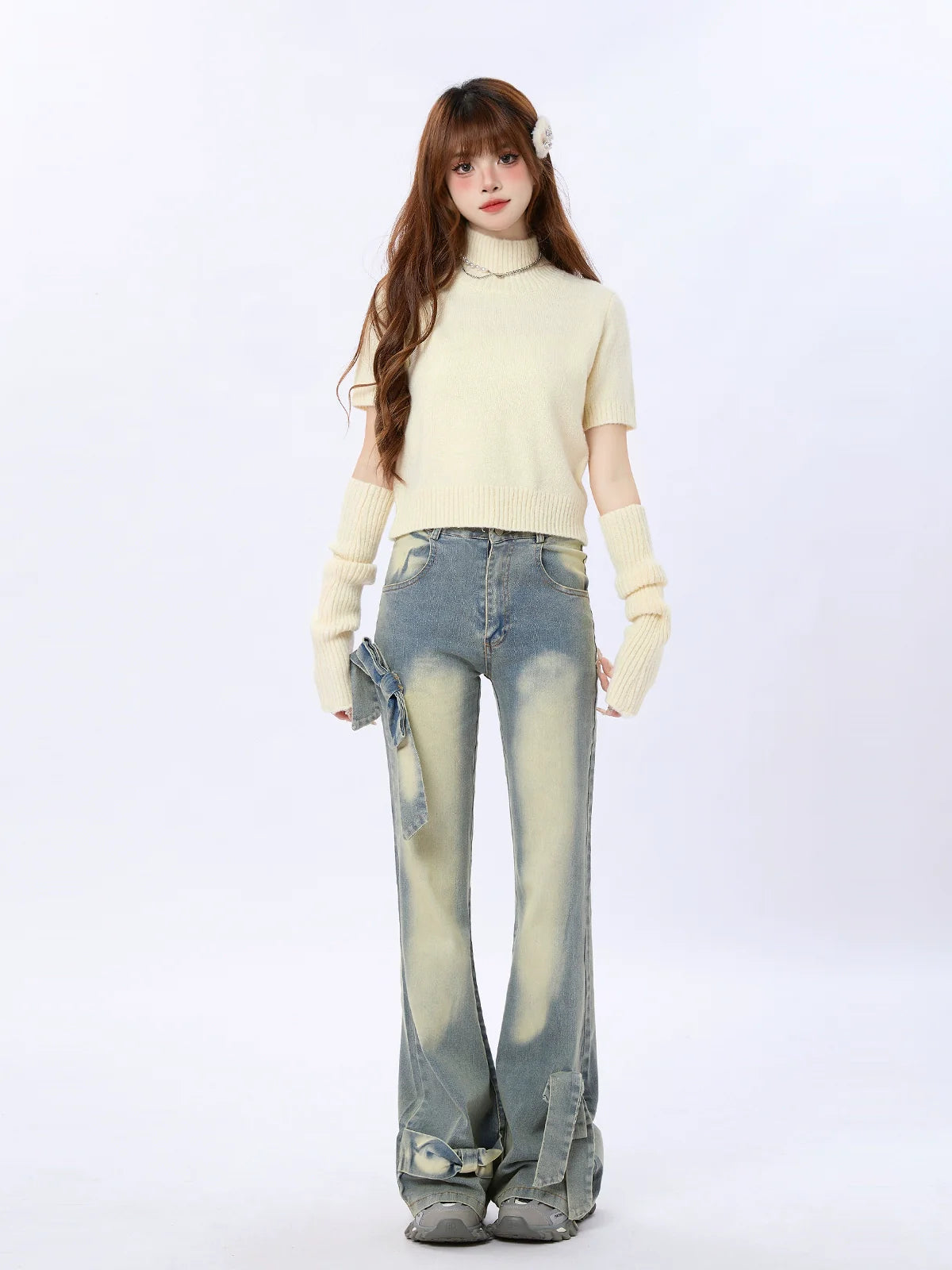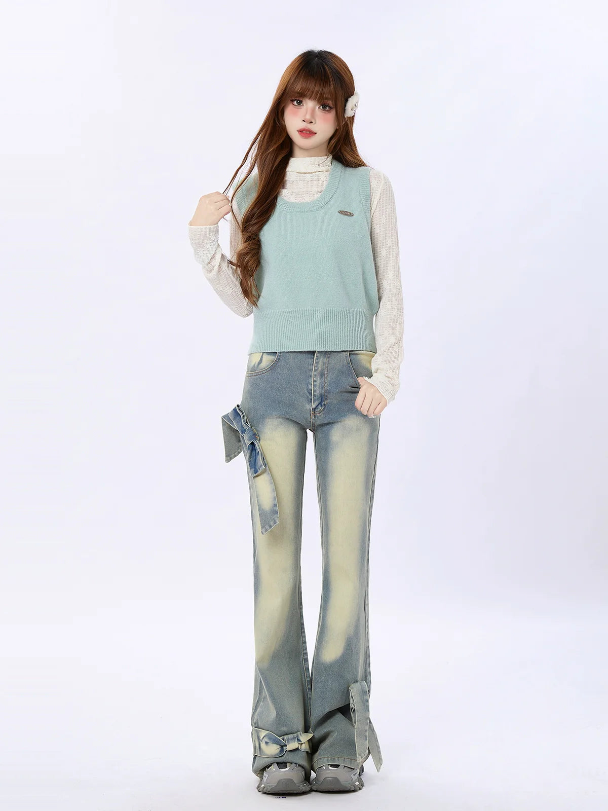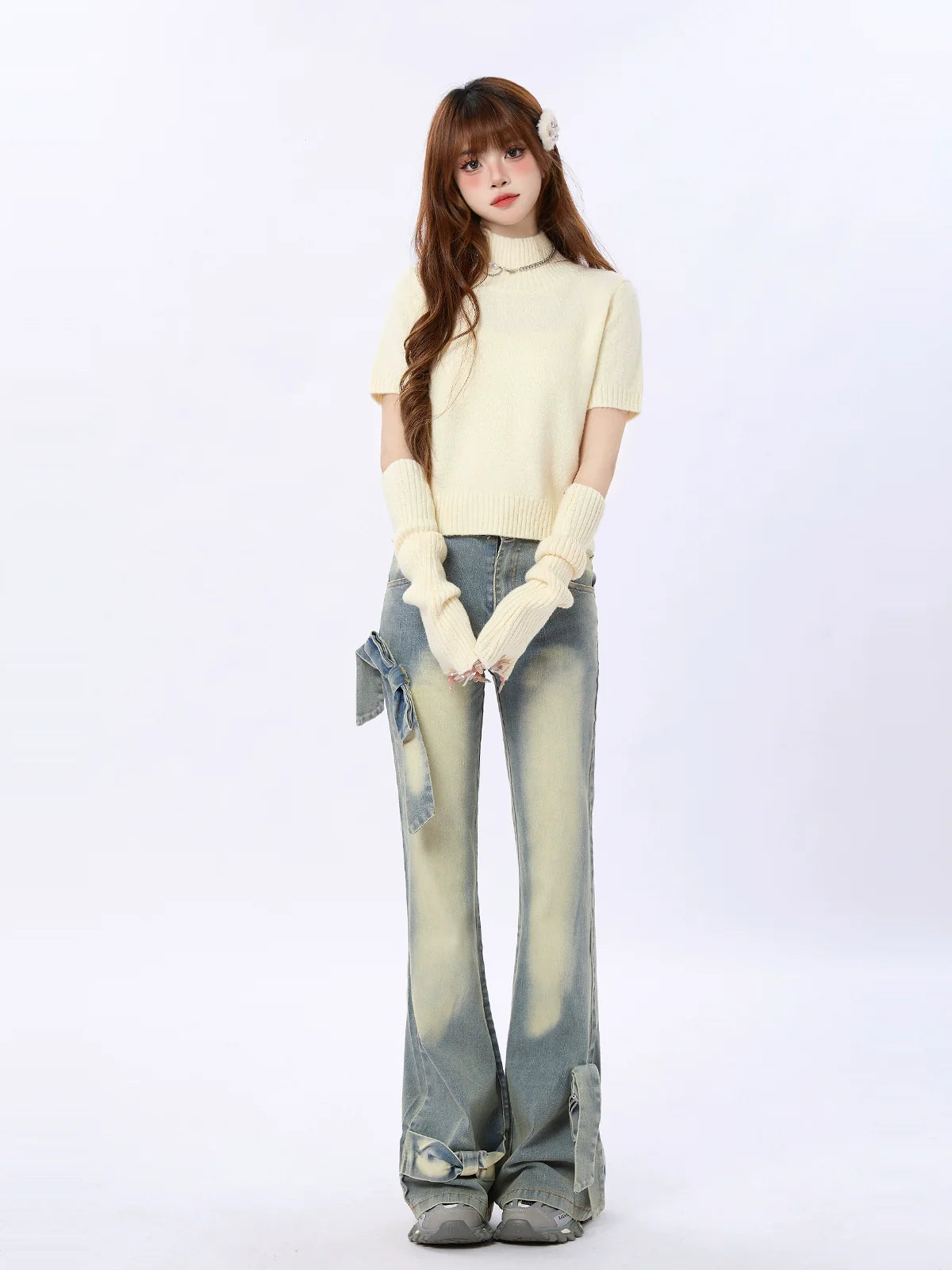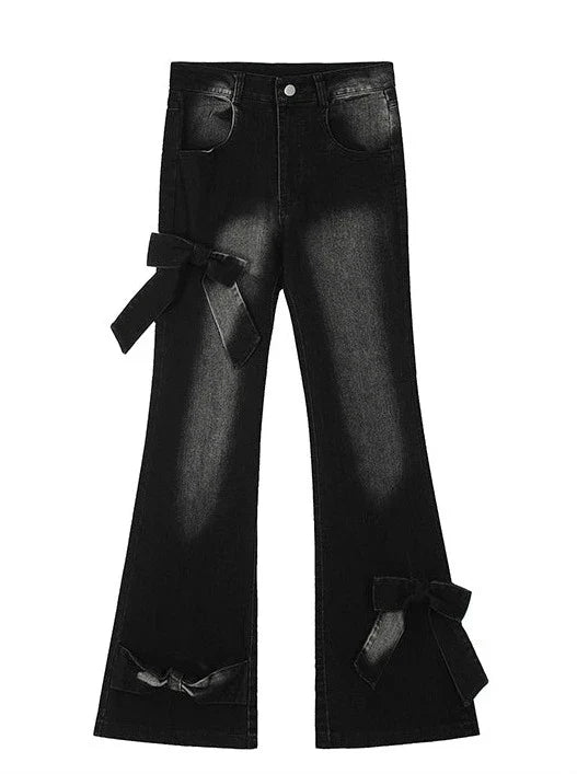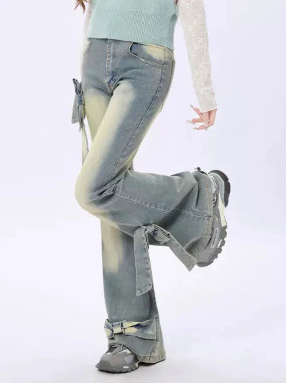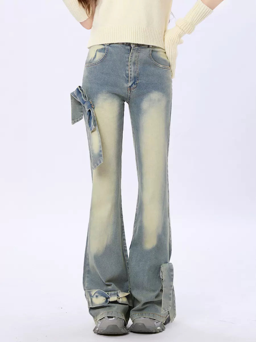 リボンスリムフレアデニムジーンズで、スタイリッシュでキュートなスタイルをキープ。スリムフレアカットがボディラインを美しく見せ、リボンがさりげないアクセントを添えます。普段使いにも、夜のお出かけにもぴったりです。