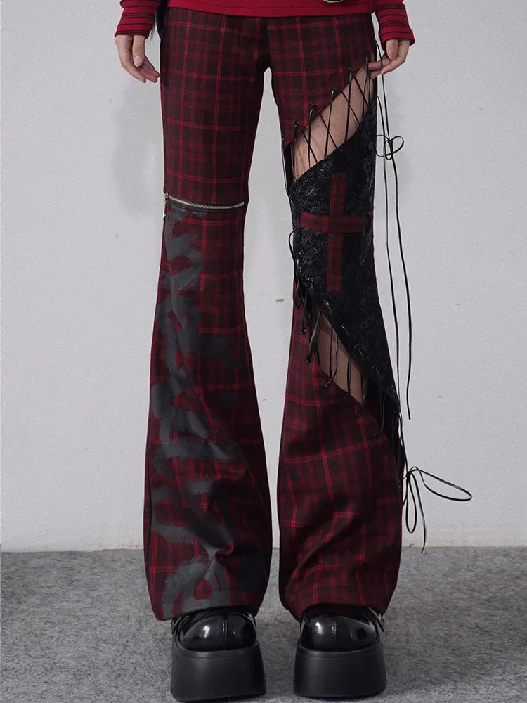 レースアップディテールの赤と黒のチェック柄パンクロックカットアウトパンツ