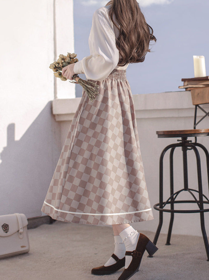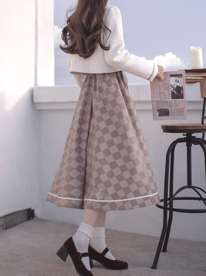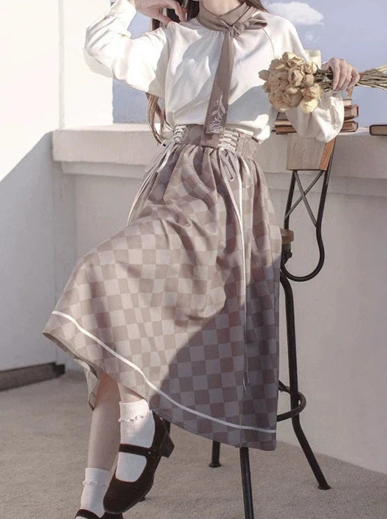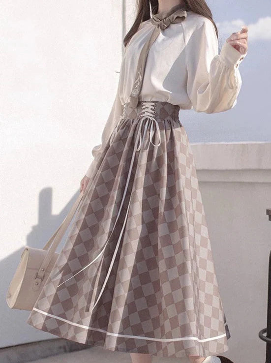 ローズスカート レトロ + ブローチ ジャケット ボウシャツ ネクタイ フレンチチェック ショートスーツ レースアップ
