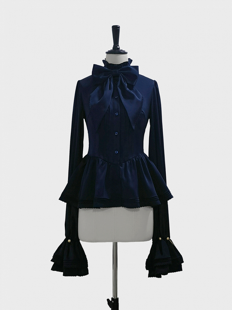 ロイヤルブルーのフリルネックライン王子ロリータ詩人袖シャツ
