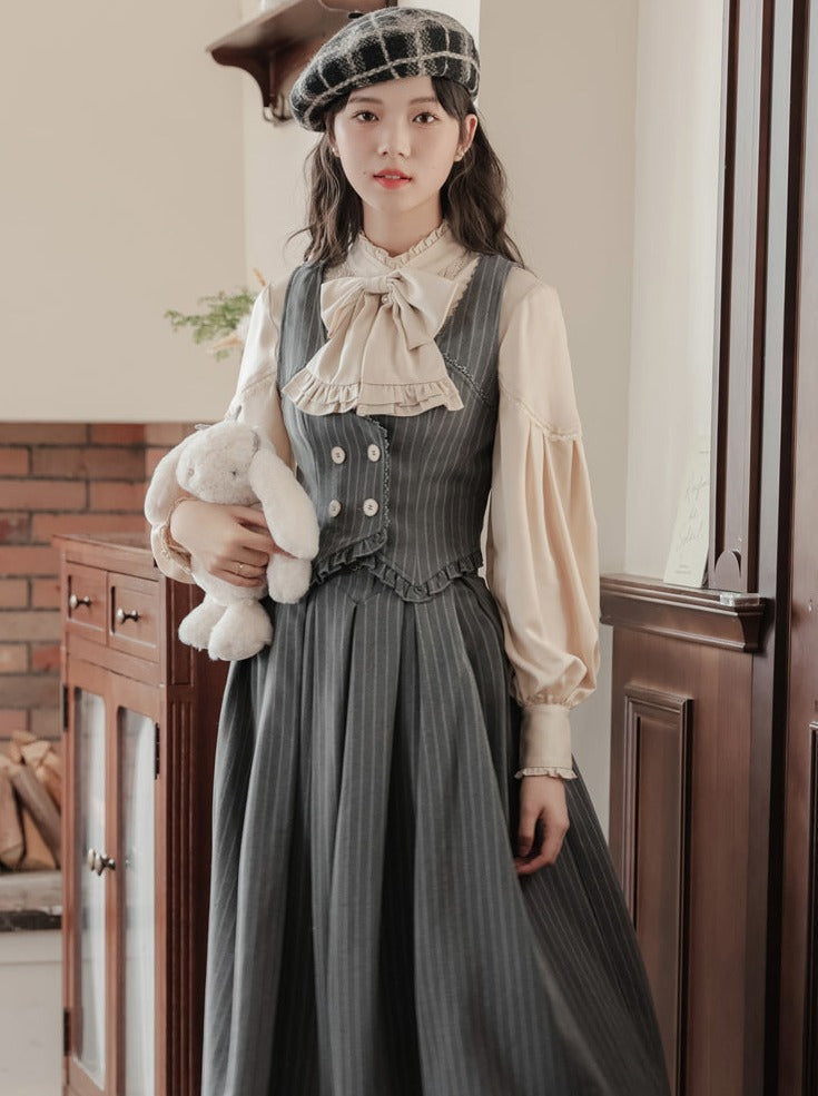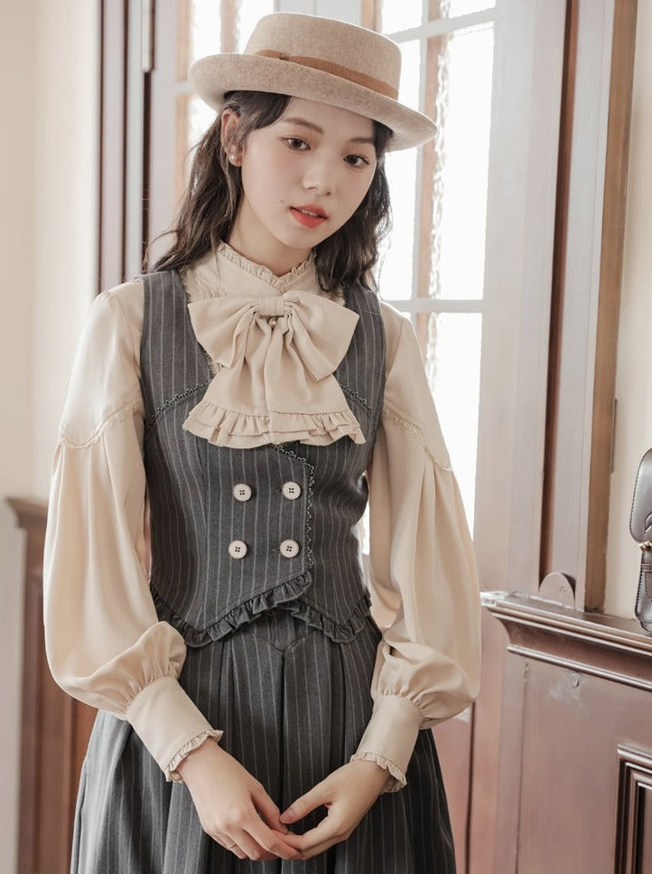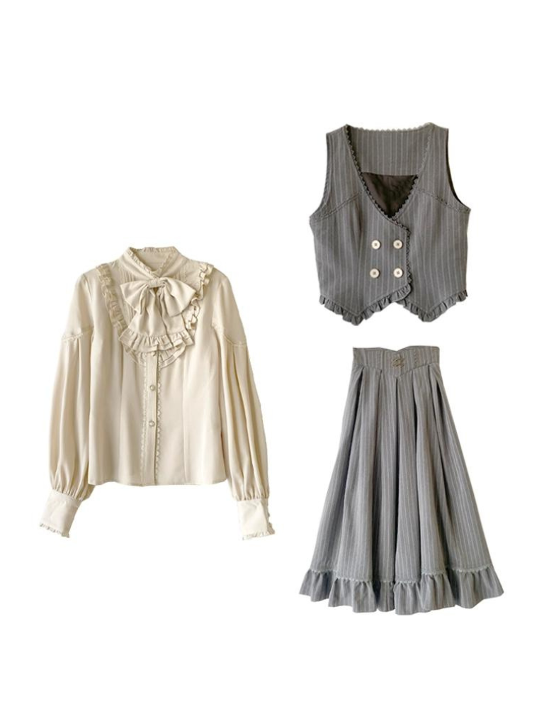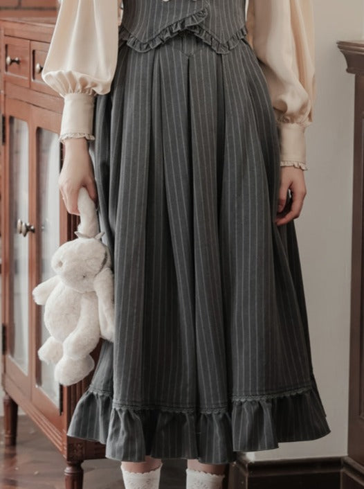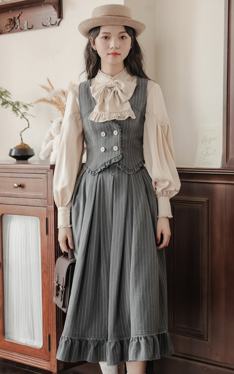 フリル+ブラウス ストライプカラー+スカート フレアレトロベスト ダーク