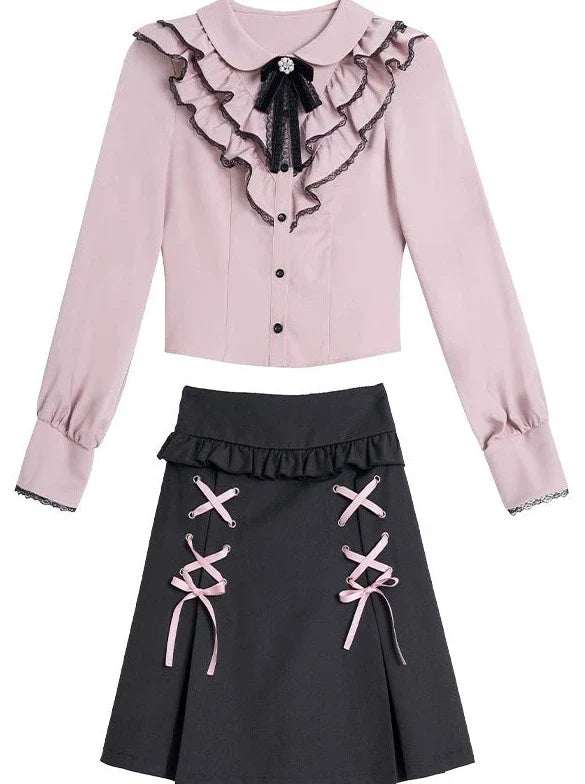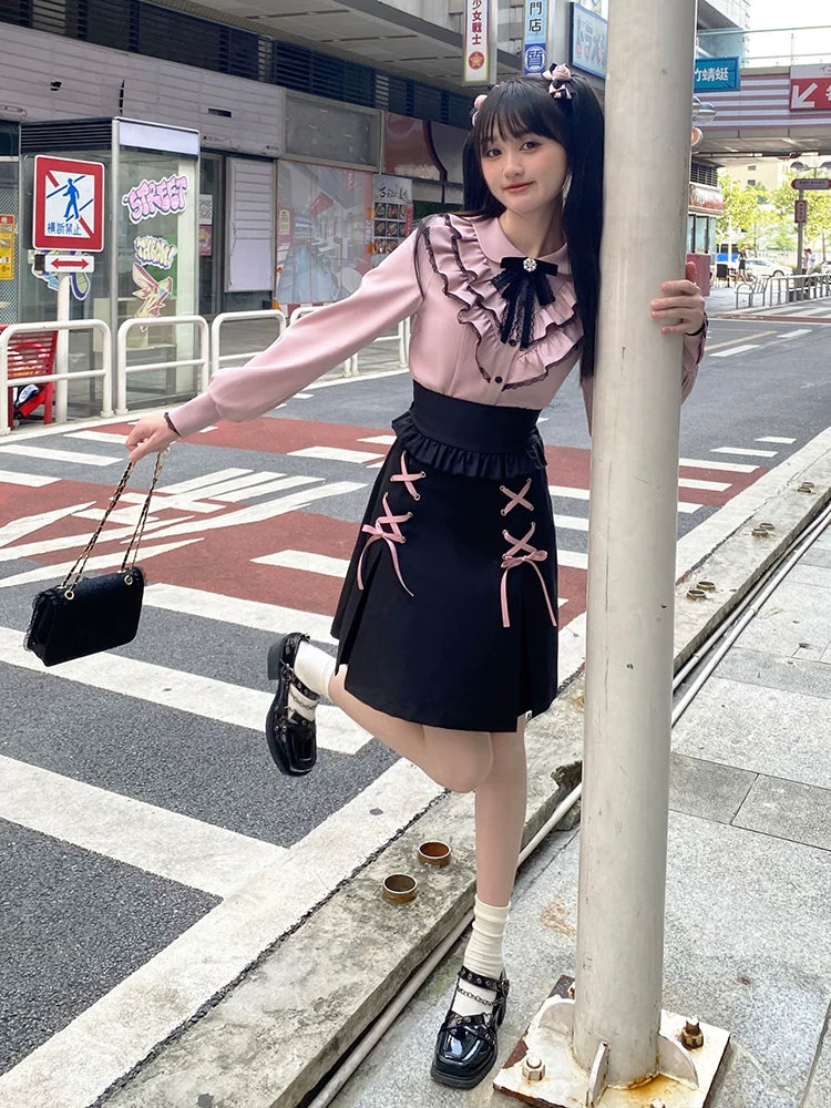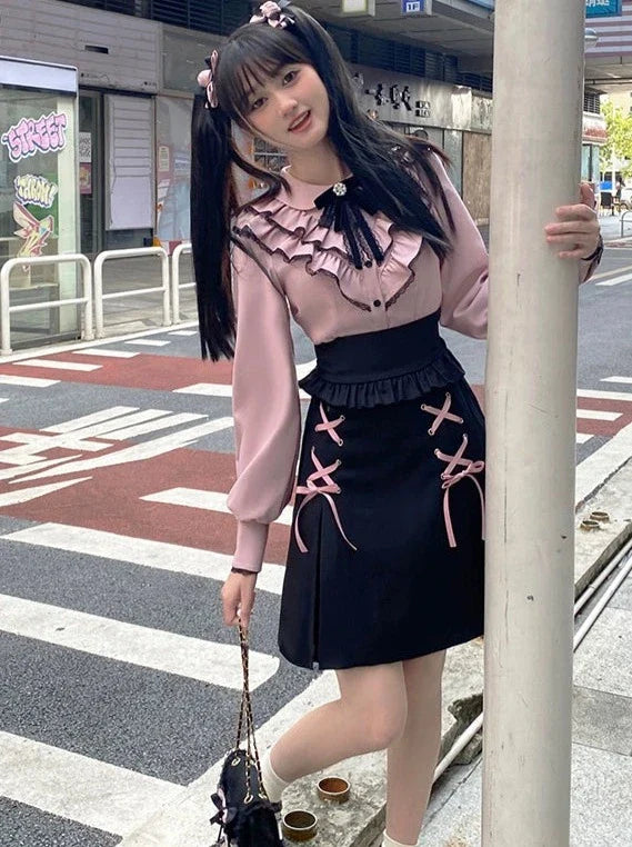 この愛らしいフリルスカートとカラーブラウス、そしてレースアップのガーリーな組み合わせは、どんなコーディネートにもキュートなアクセントを添えてくれます。フリルスカートとレースアップデザインが、個性的でガーリーな雰囲気を演出します。人と差をつけたい、個性を主張したいあなたにぴったりです。