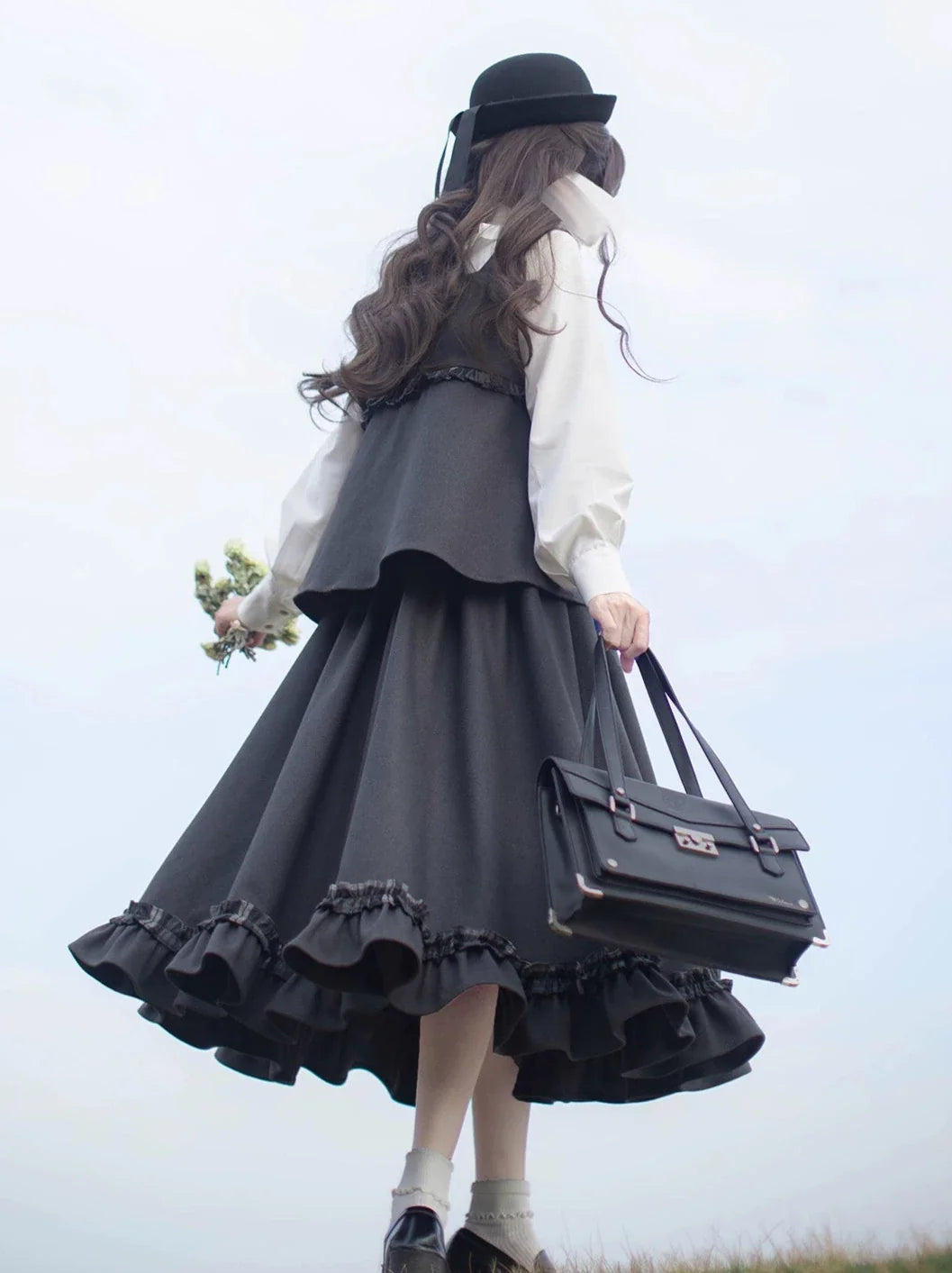 愛らしいラッフルスタイルのチェックスカートスーツは、チャーミングなリボンのディテールとクラシックな白いカレッジシャツが特徴です。フリルとベストがスタイルを格上げし、どんなシーンにもぴったりです。このオリジナルアンサンブルで、スタイリッシュでキュートな装いを演出しましょう。