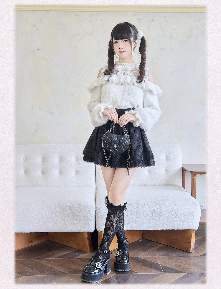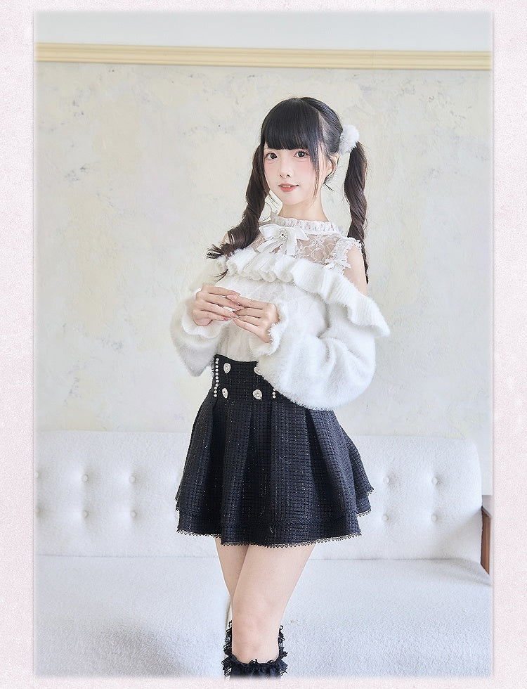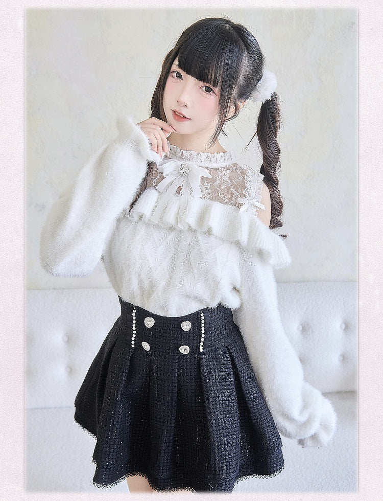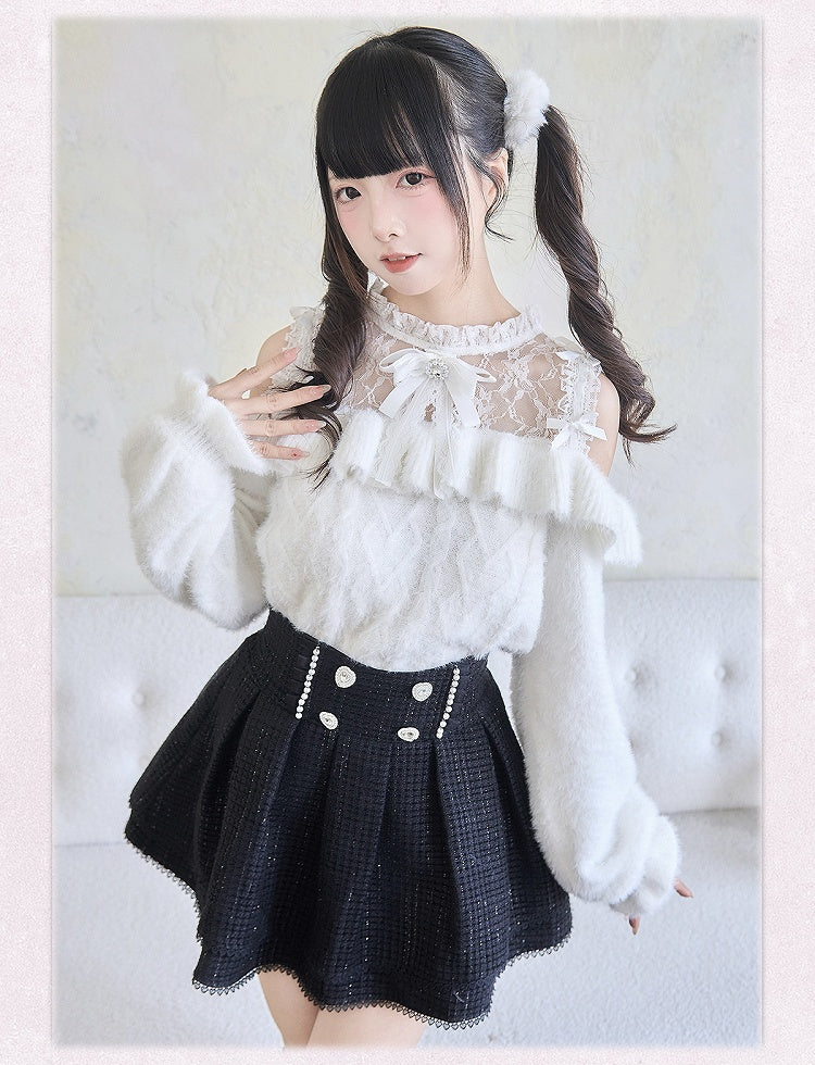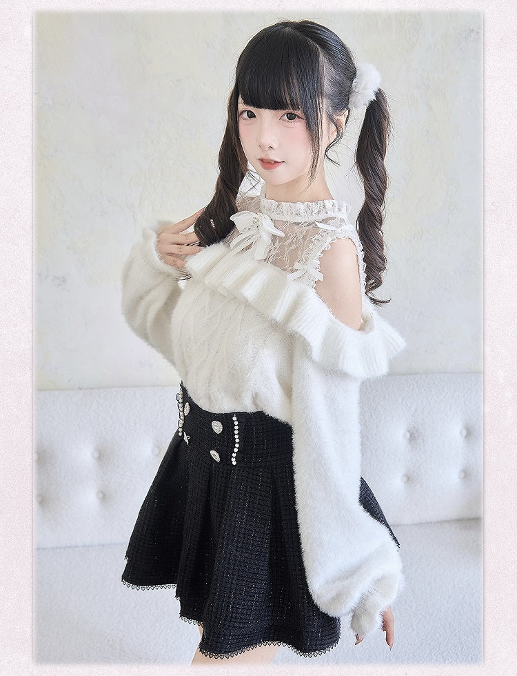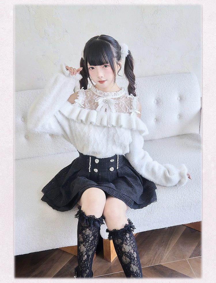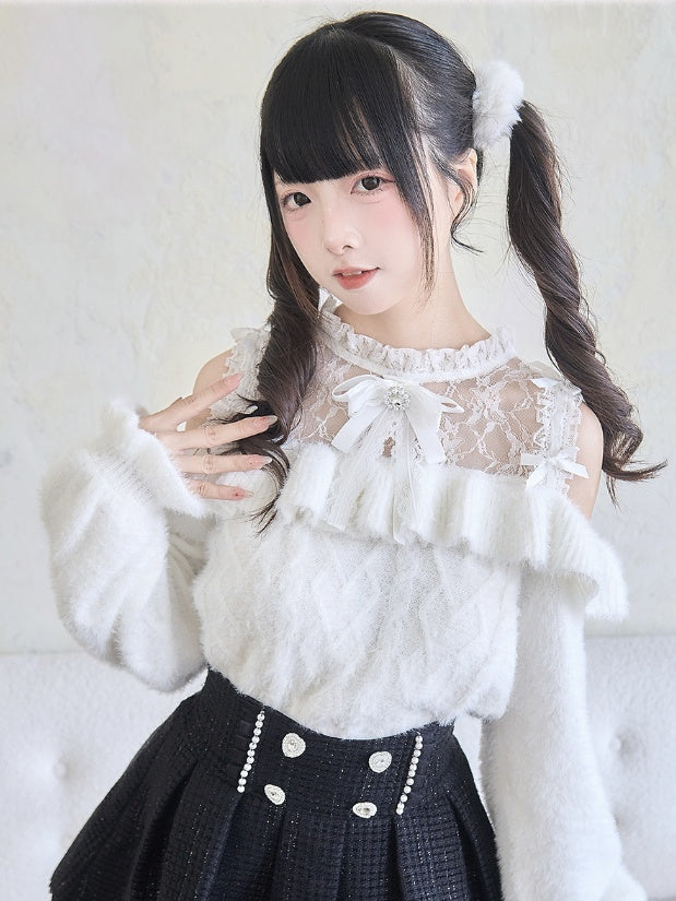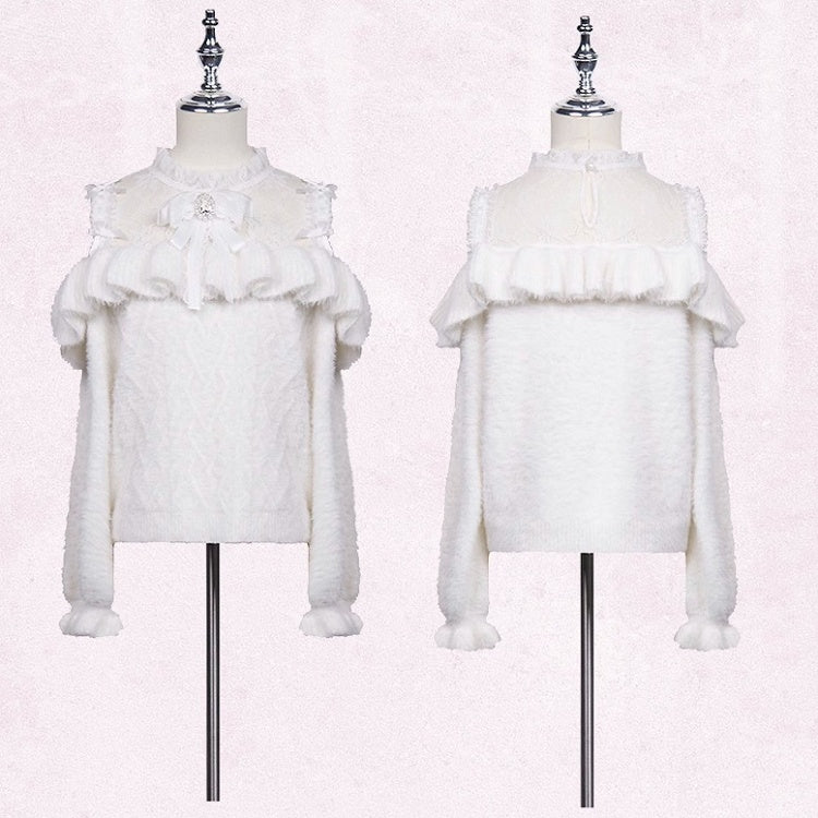 ジライカイ コントラストレースパッチ ラッフルトリム カットアウトショルダー ボウノット ホワイトセーター