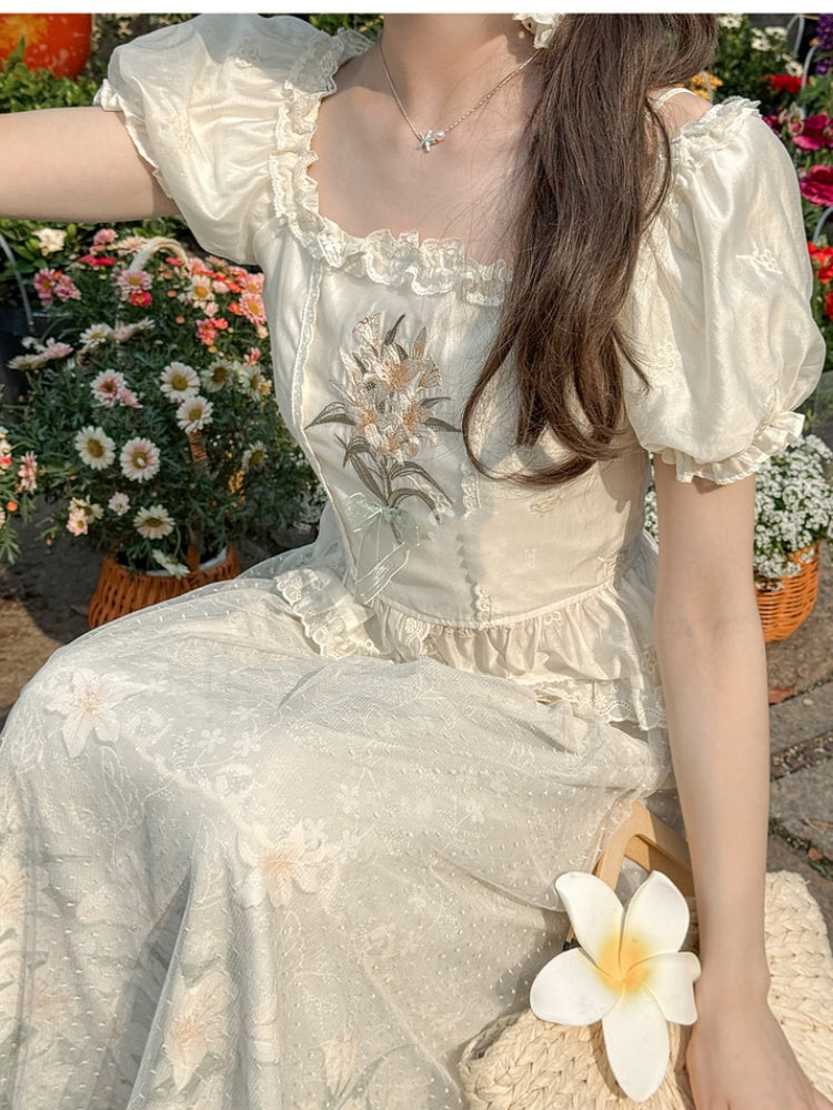 ベージュのフリル付きスクエアネックライン、パフスリーブ、ユリの刺繍、レーストリムのブラウス