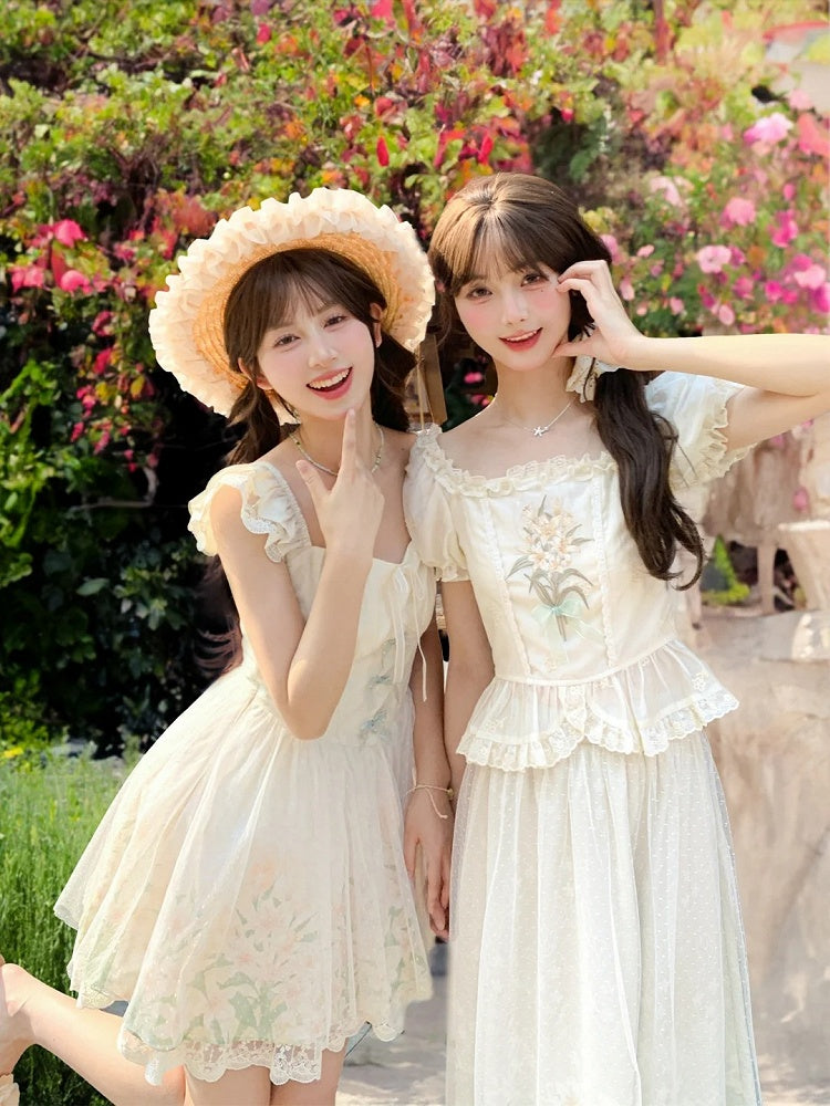 フリルネックライン、パフスリーブ、ユリの刺繍、レーストリム、スクエアブラウス、ベージュ