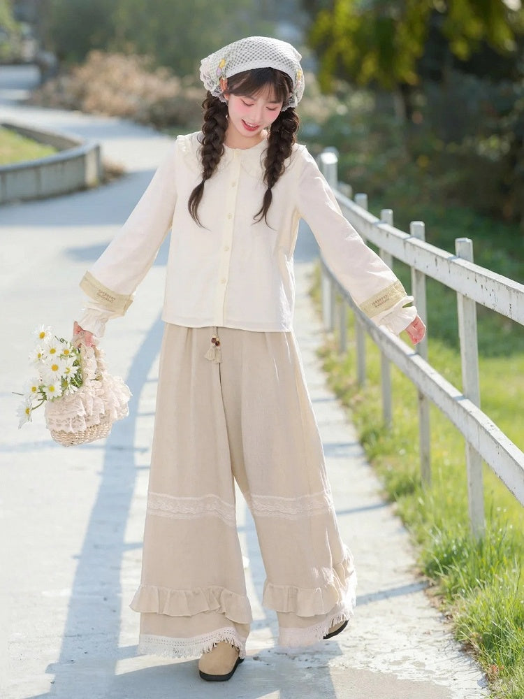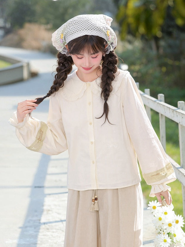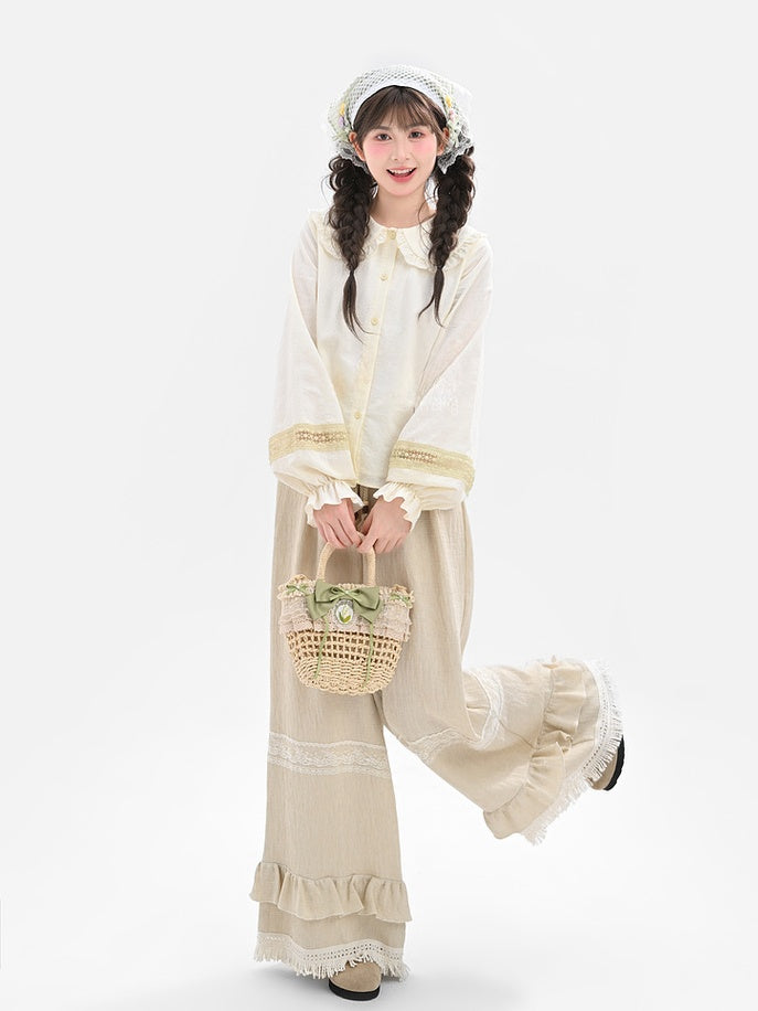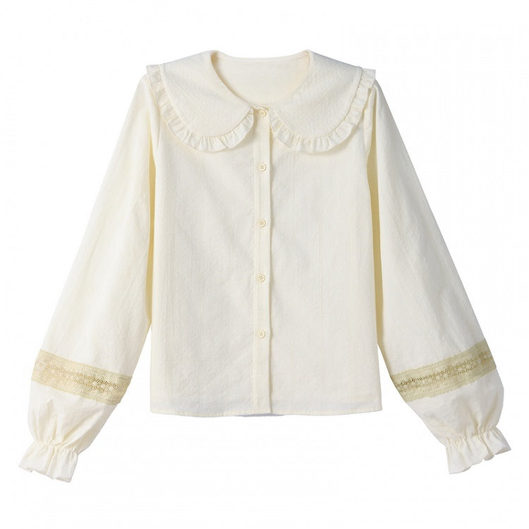 ライトイエローのフリル付きピーターパンカラー長袖ブラウス