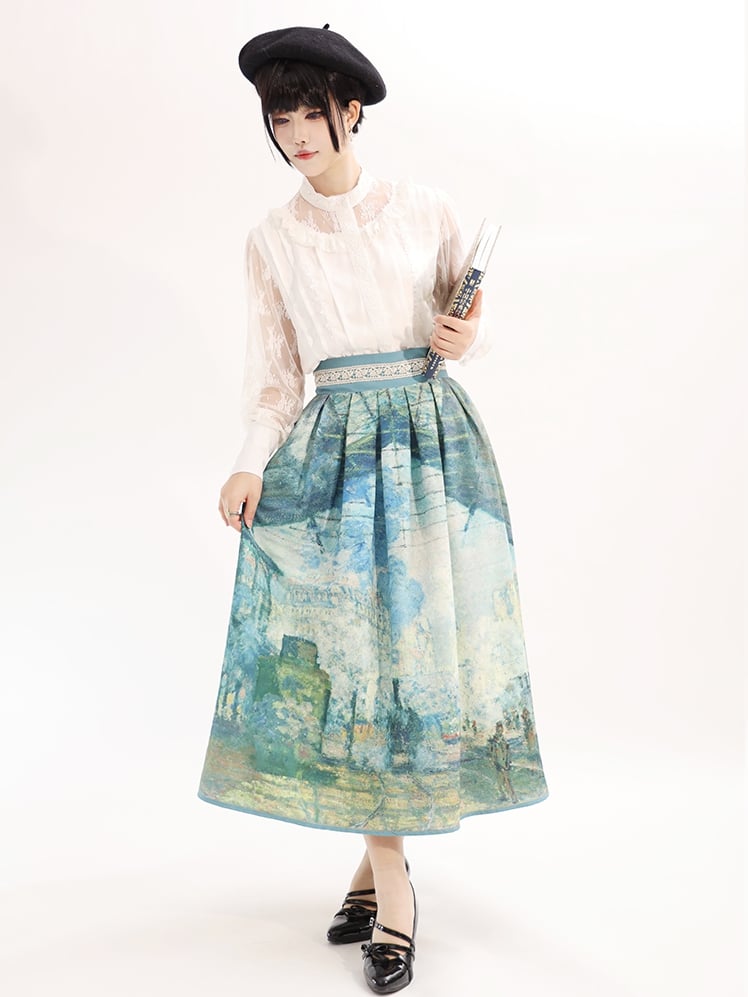 サン・ラザール油絵プリント グリーンウエストスカートバージョン ガレ ロング/ショート ハイ