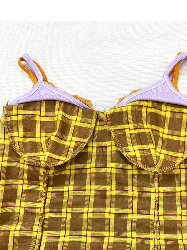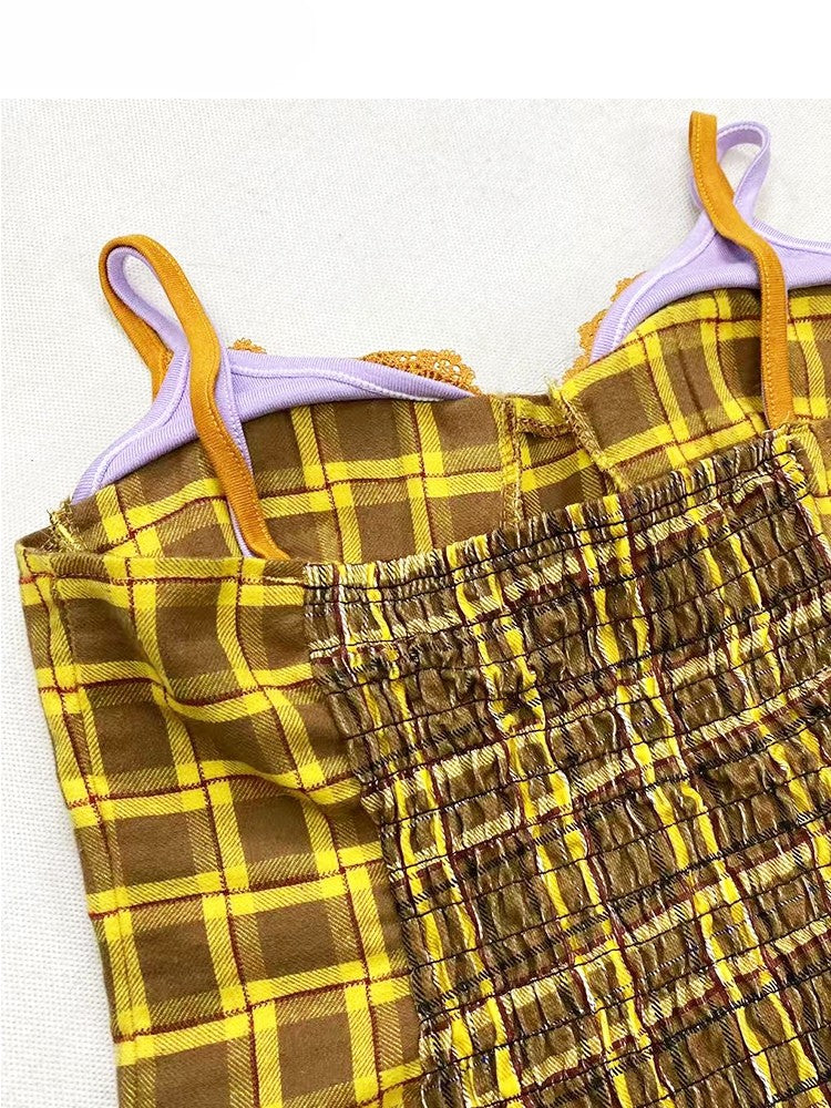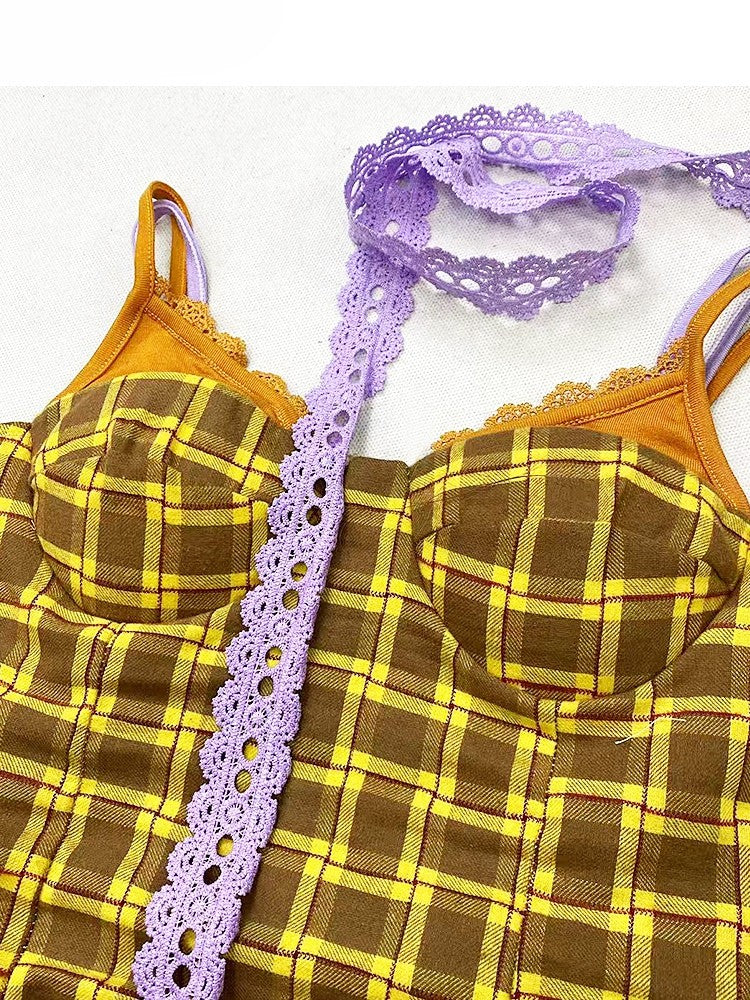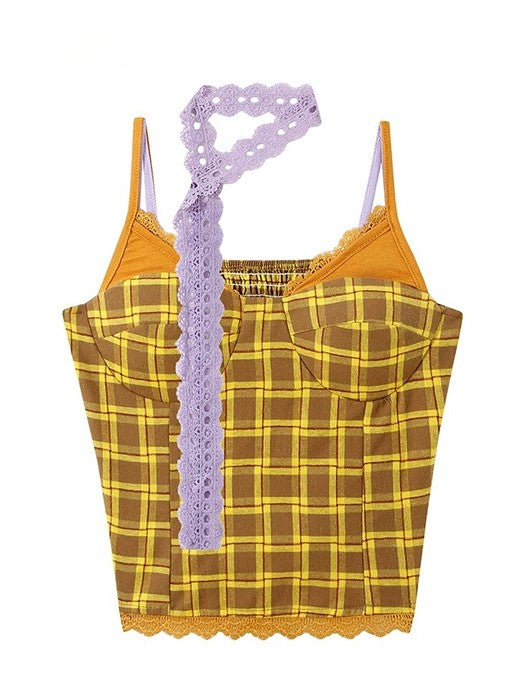 スカーフキャミトップパープルチェック柄Y2Kイエロー