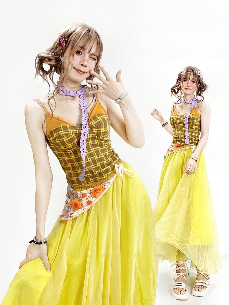 イエローのY2Kチェック柄キャミソールトップスとパープルのスカーフ