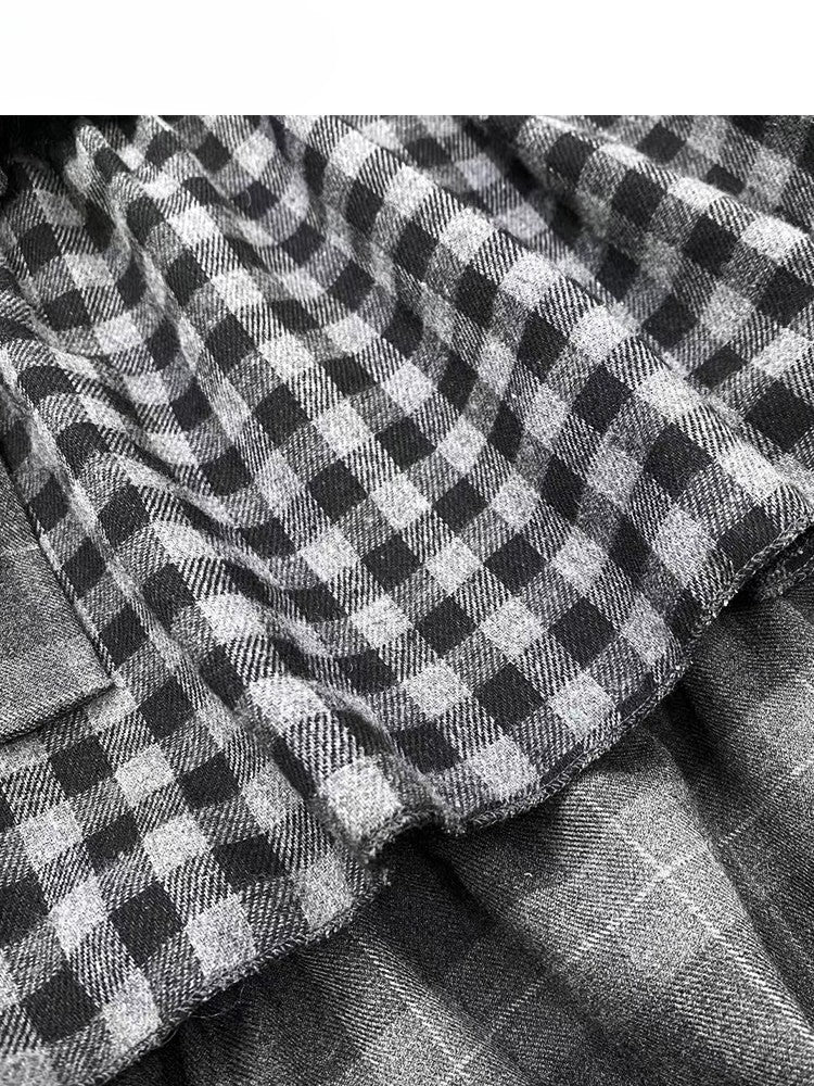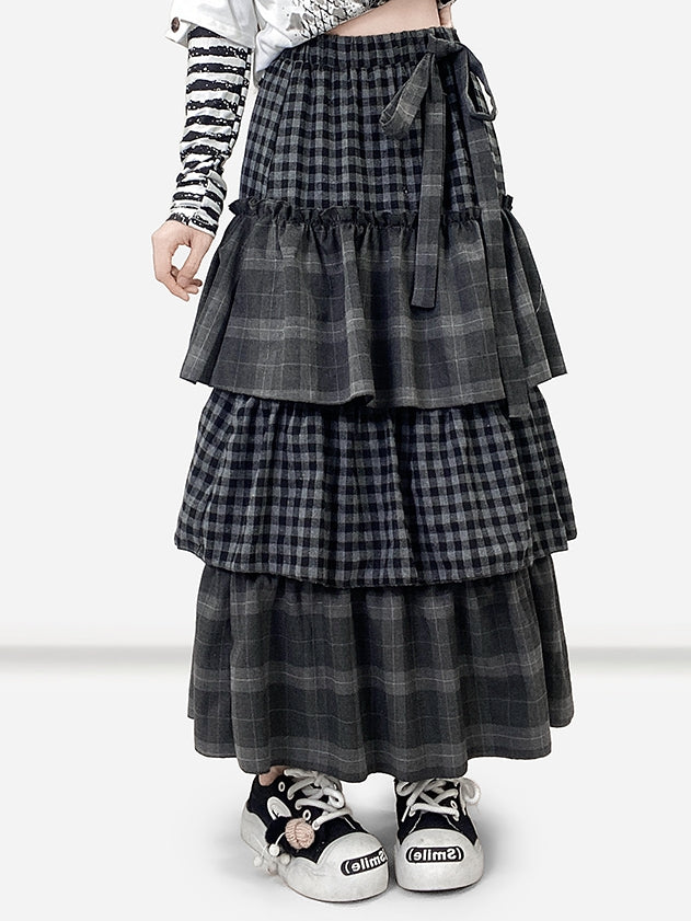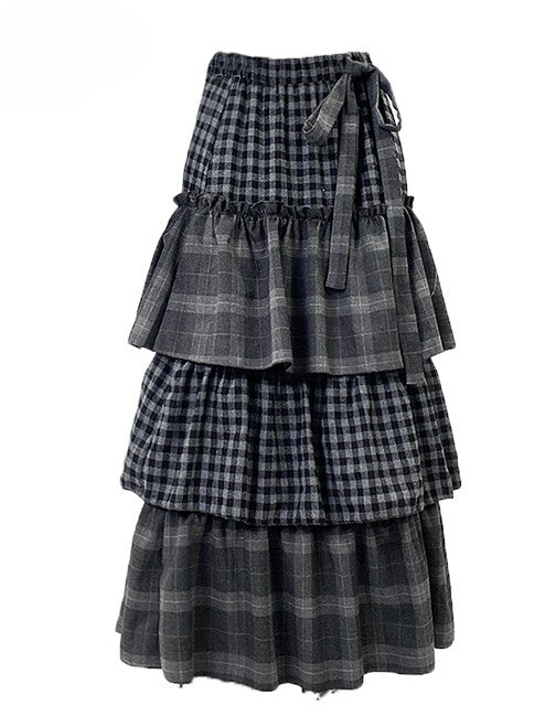 ダークグレーのほろ苦いチェック柄セルフタイストラップティアードスカート