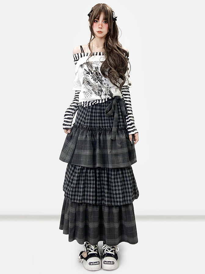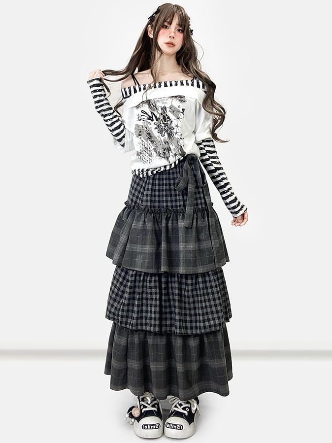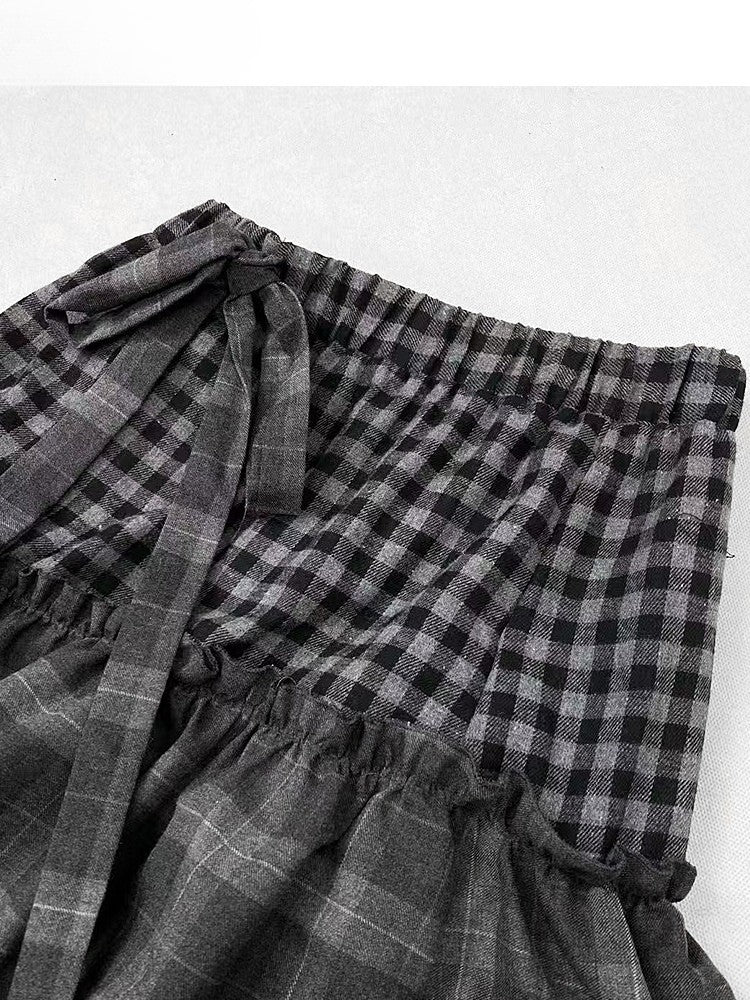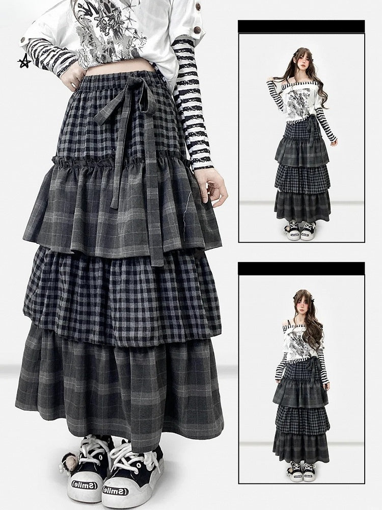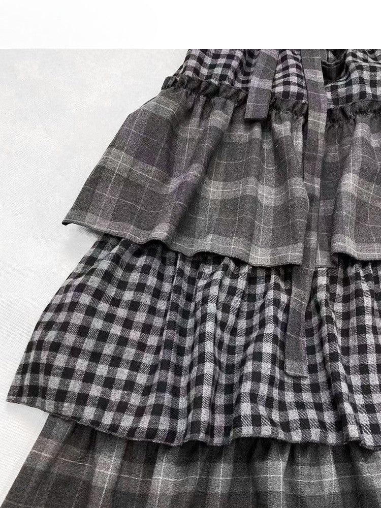 セルフタイダークストラップティアードチェックグレーパターンスカートビタースイート