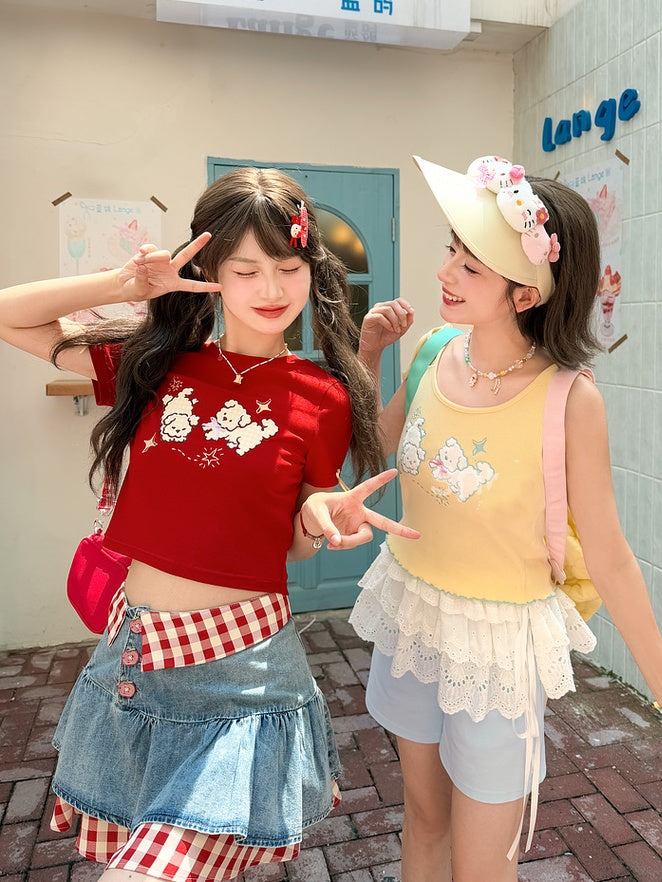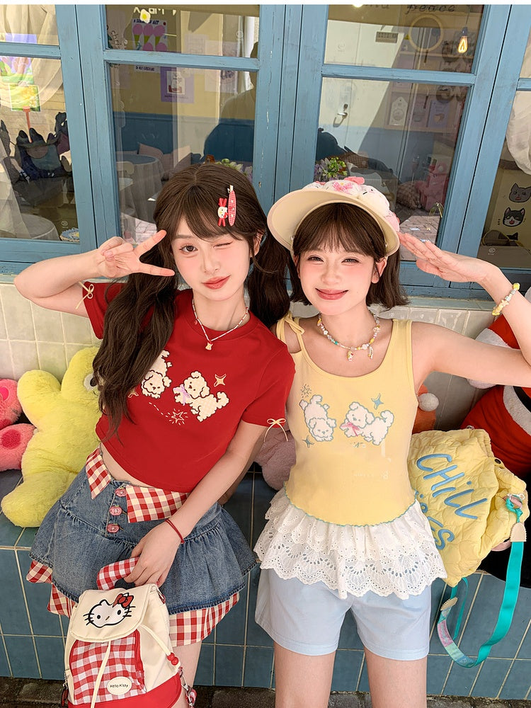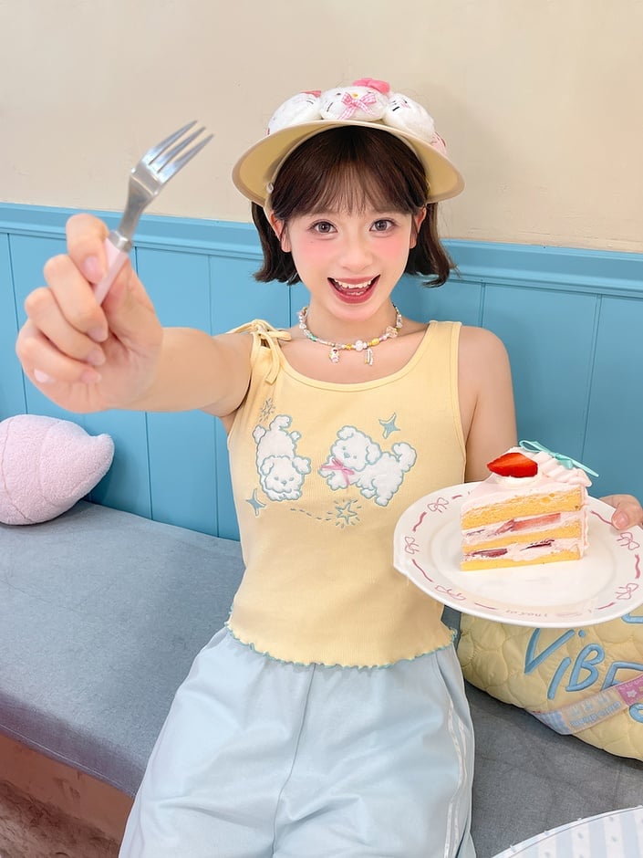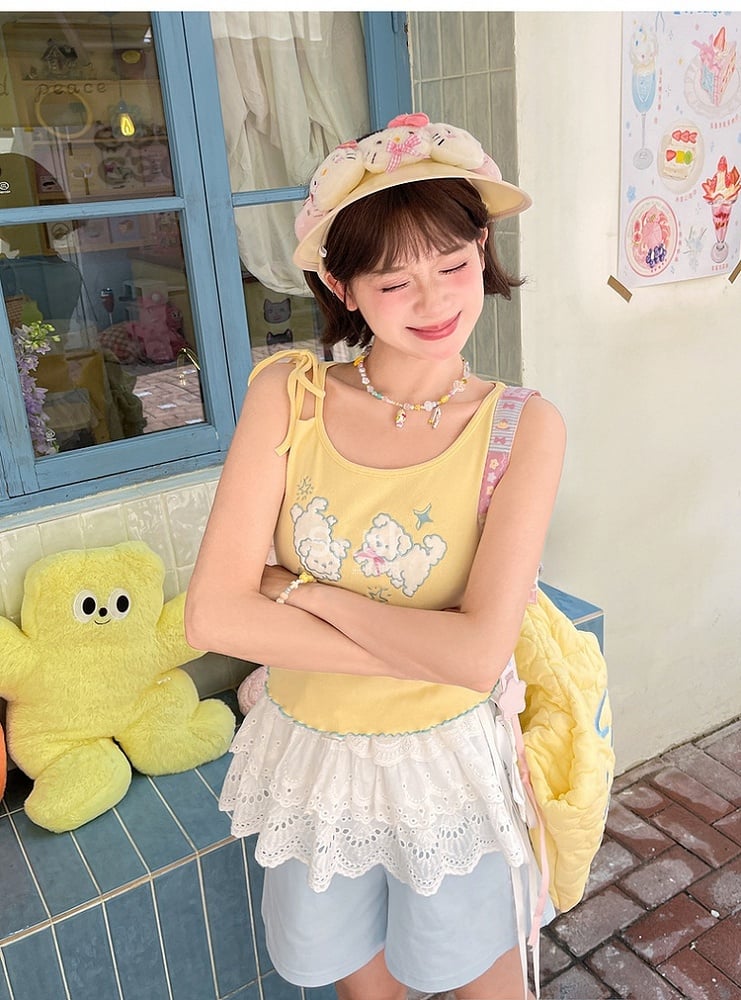 セルフタイイエローパピー刺繍レタス裾タンクトップストラップショルダー付き