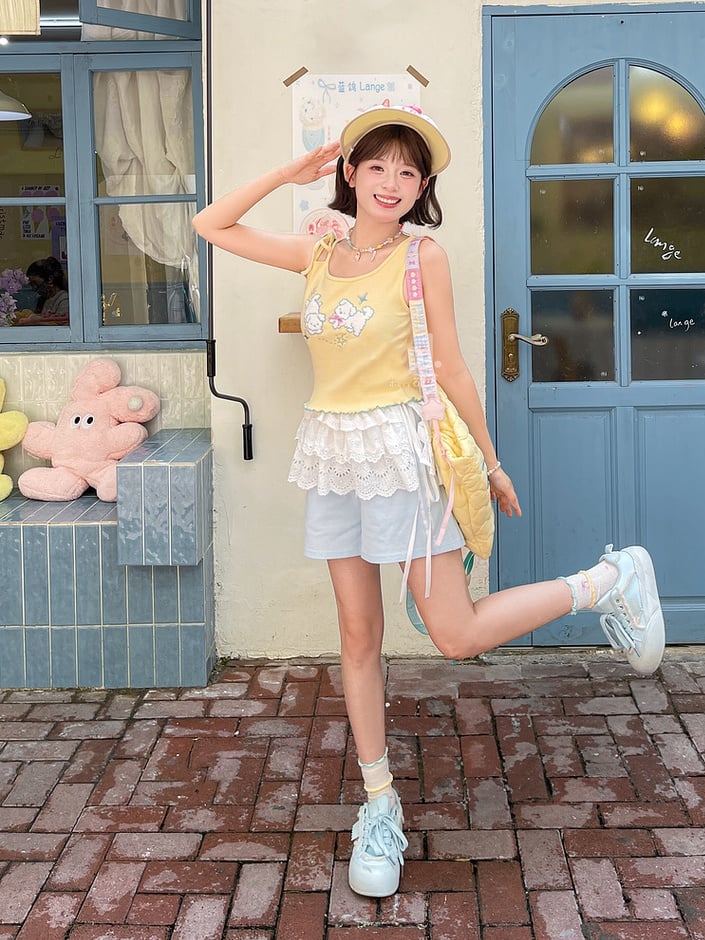 イエローパピー刺繍レタスヘムタンクトップ(セルフタイショルダーストラップ付き)