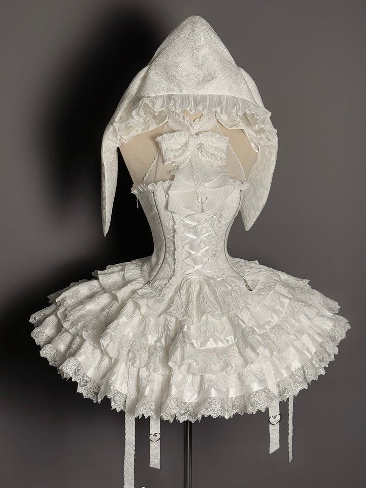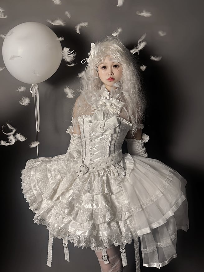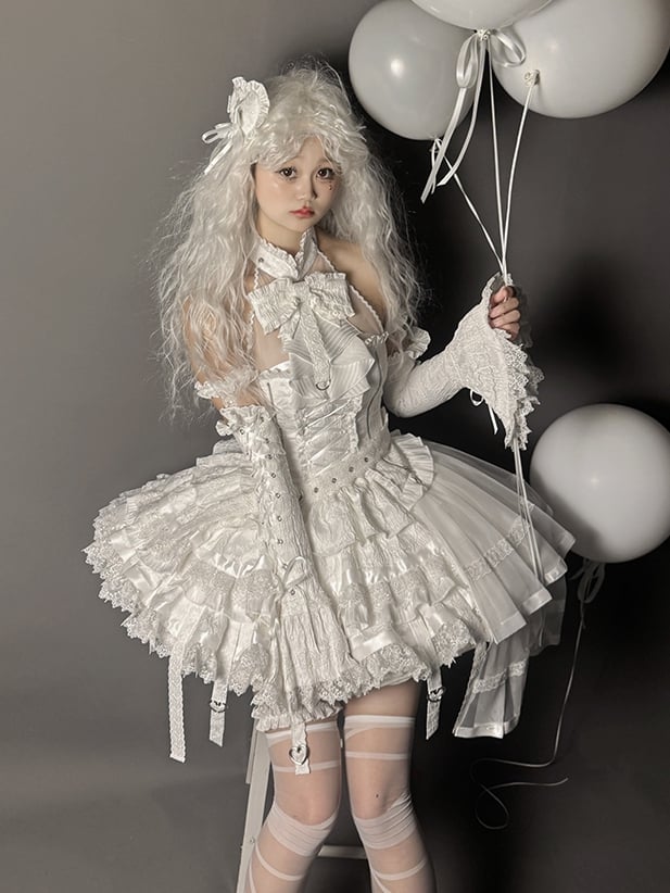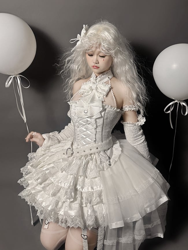 ホワイトホルターネックノースリーブトップス + シロゴシックロリータティアードスカートフルセット