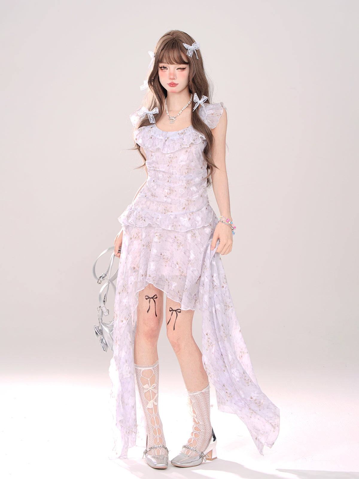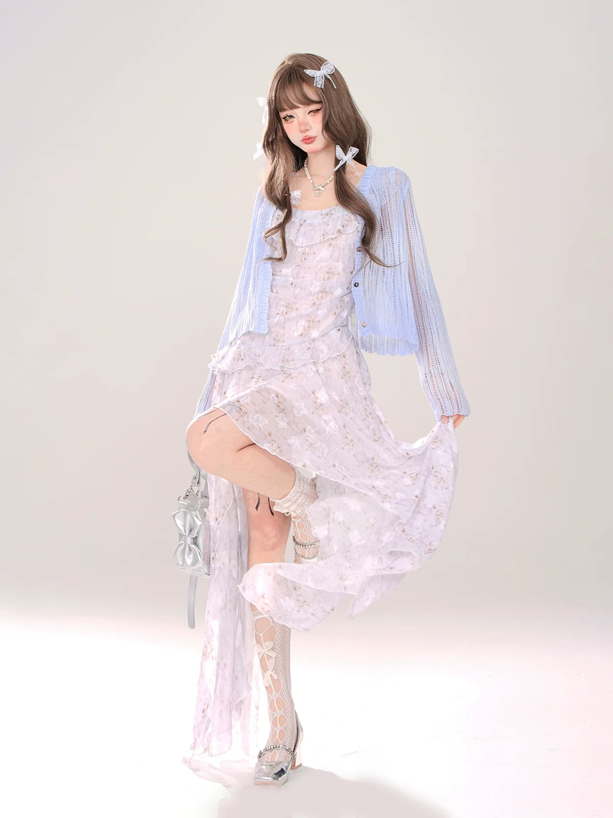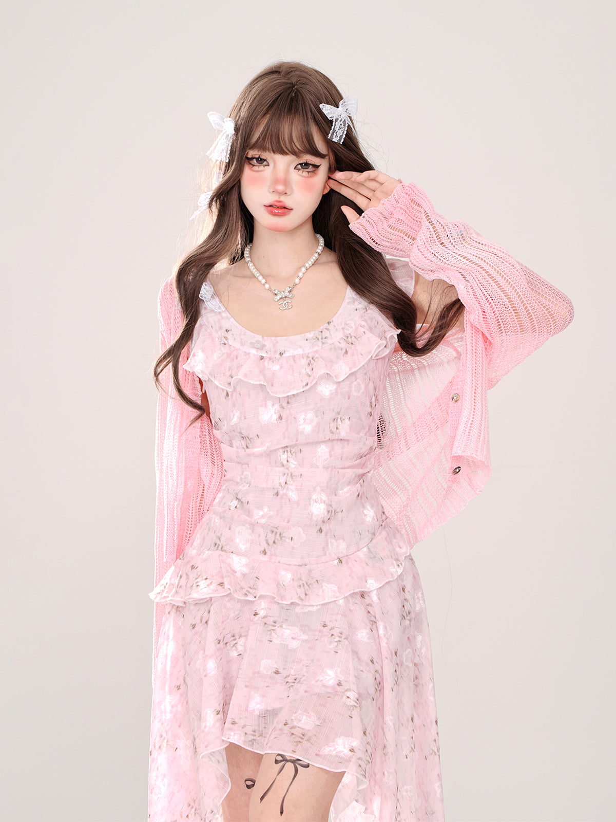 透け感のあるフローラルフリルのスイートドレスカーディガン + イレギュラーミルキーロング