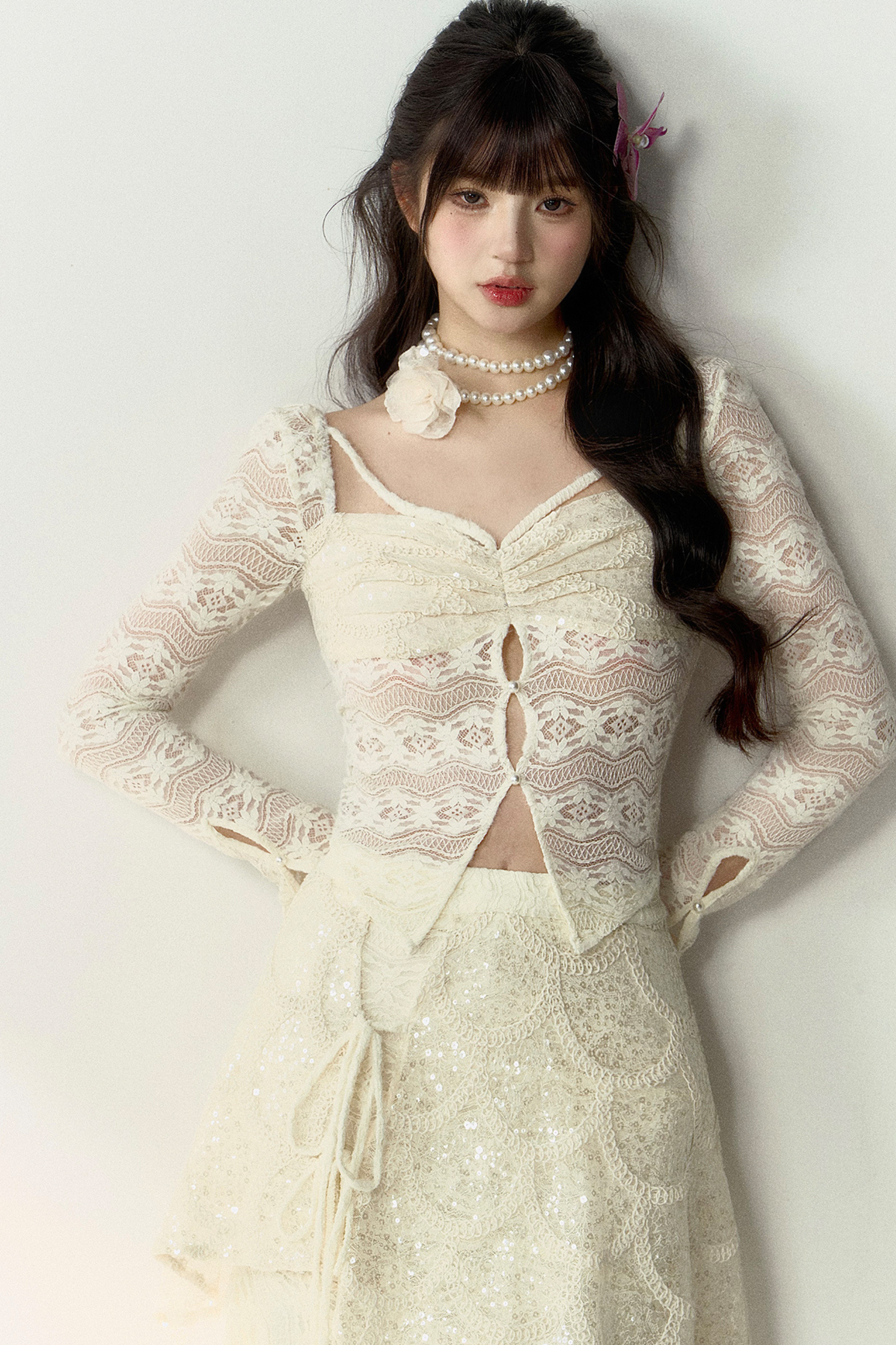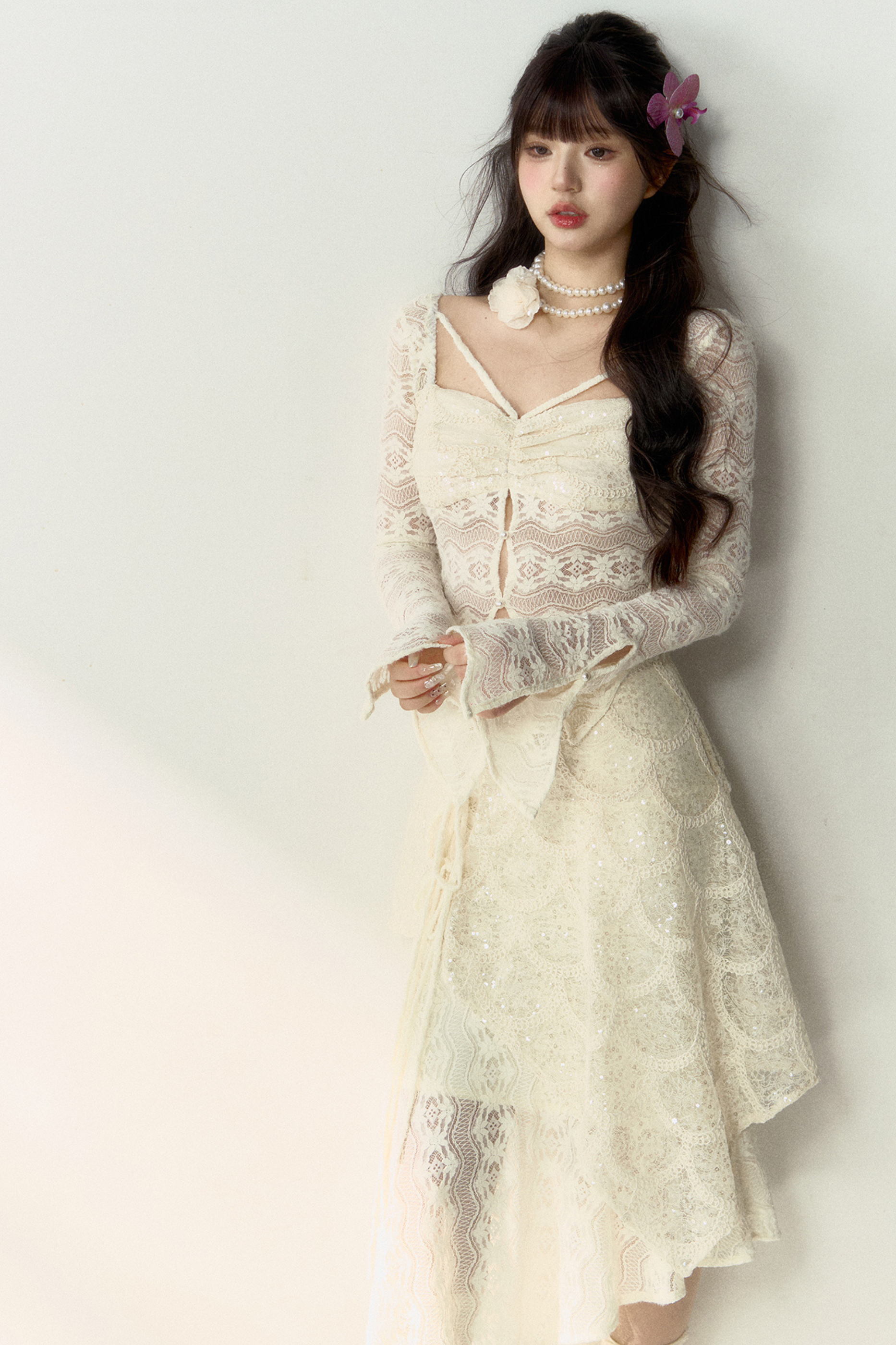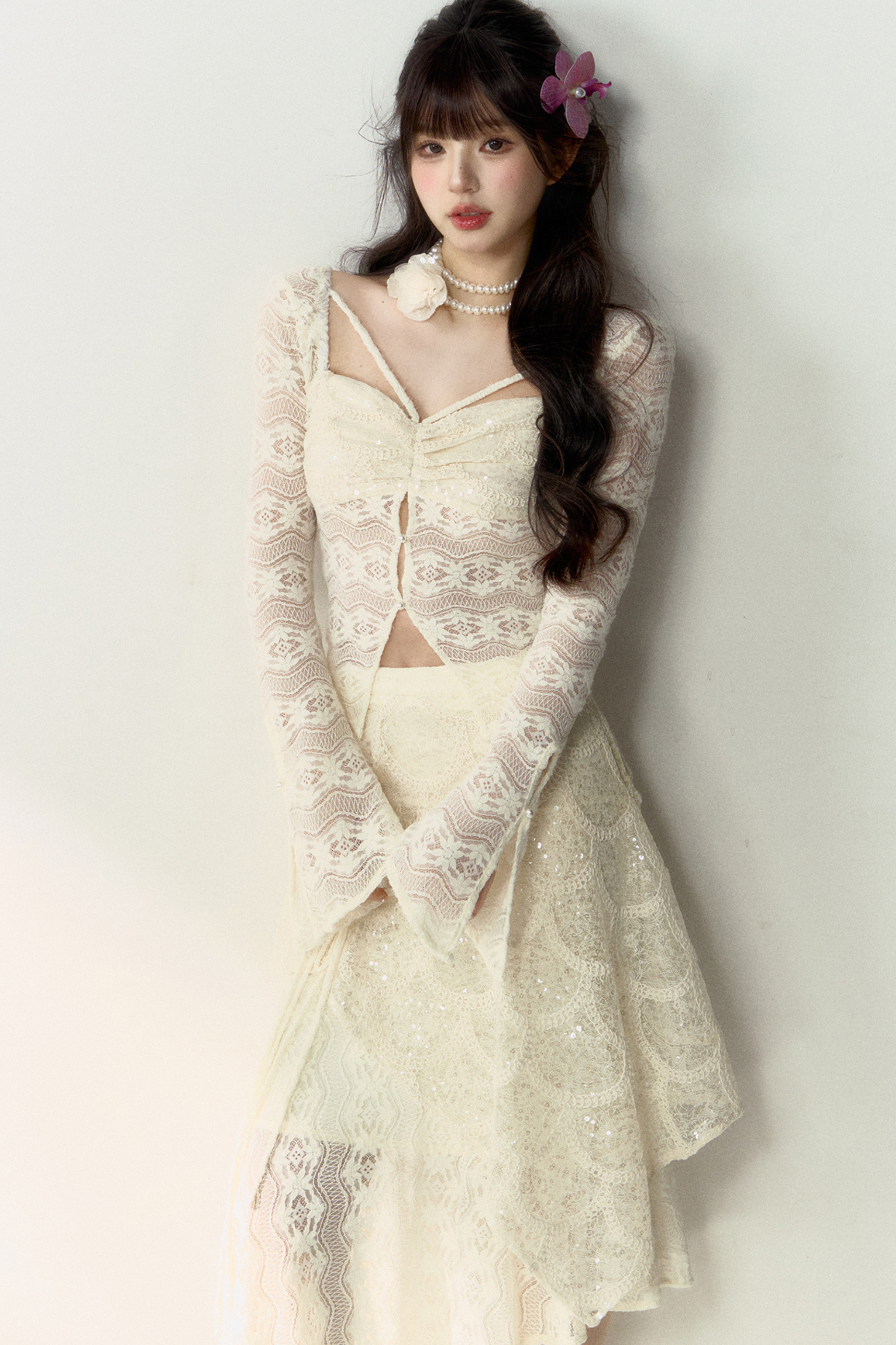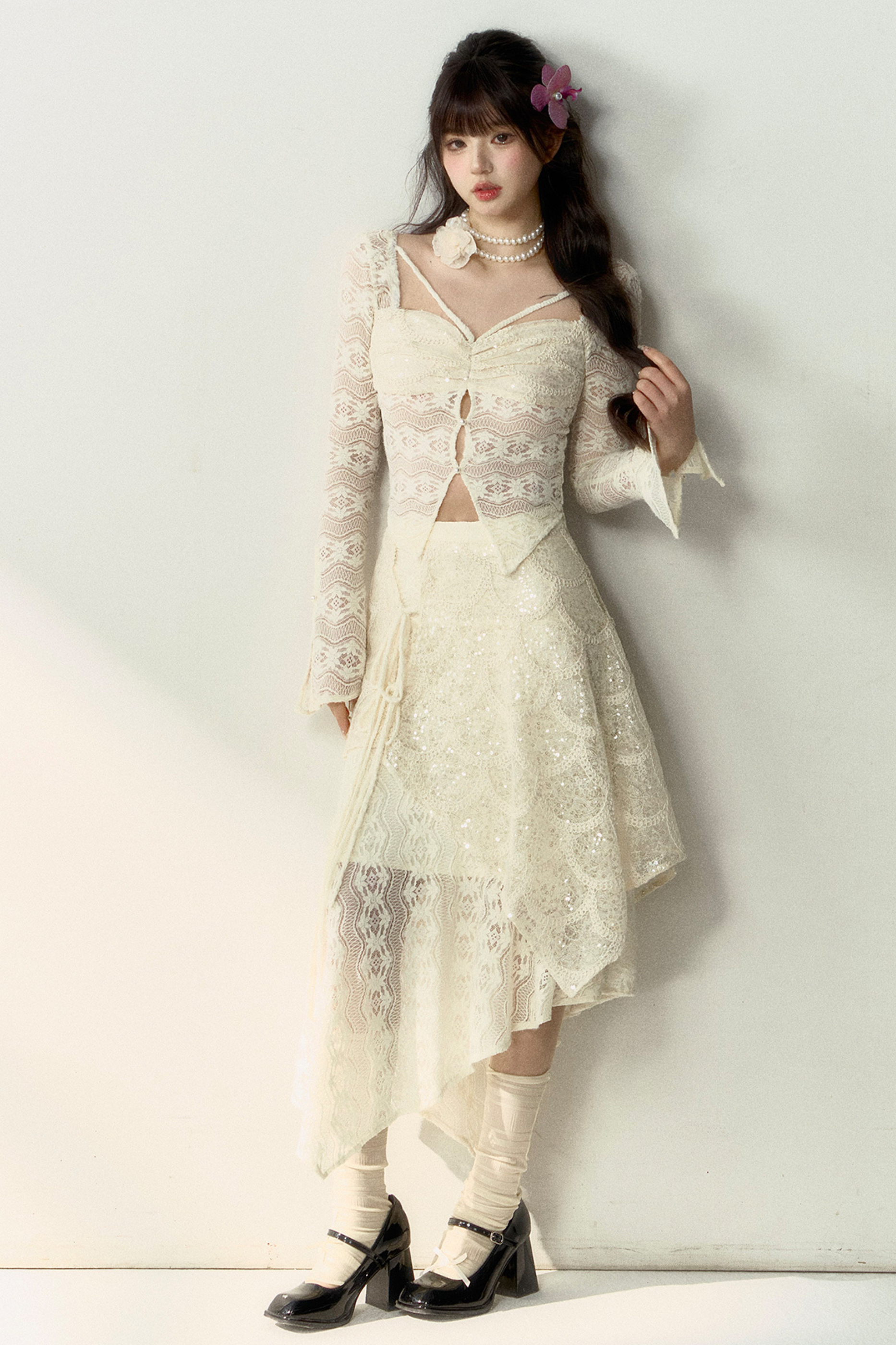 ❤フレンチシャイニーレースシアートップ + アシンメトリースカート❤