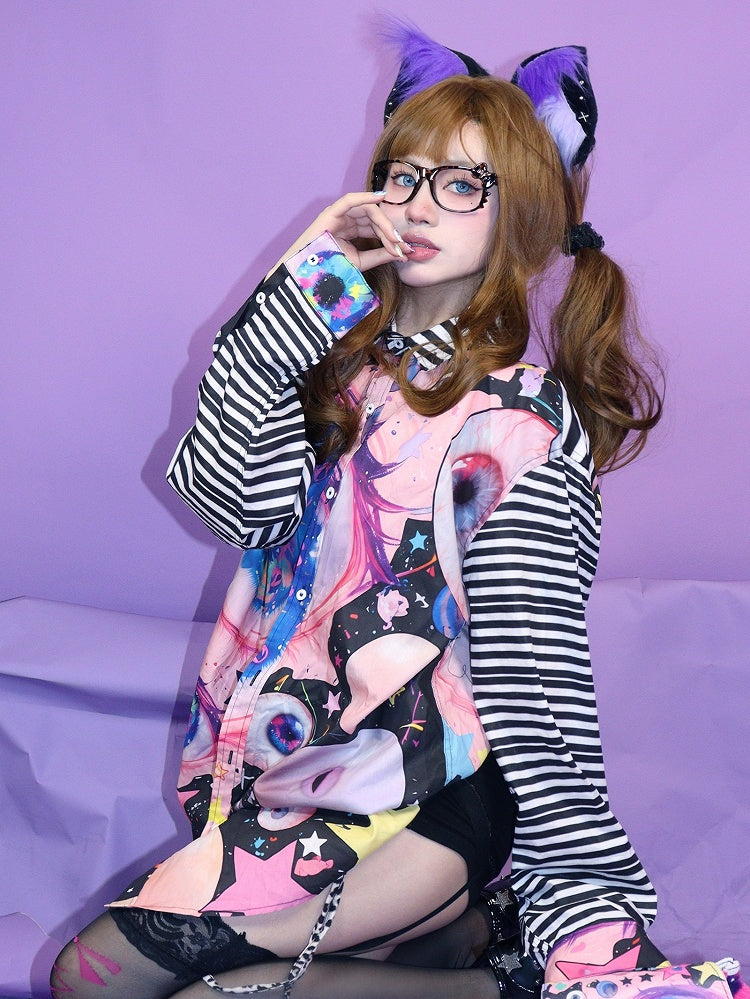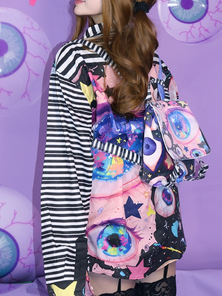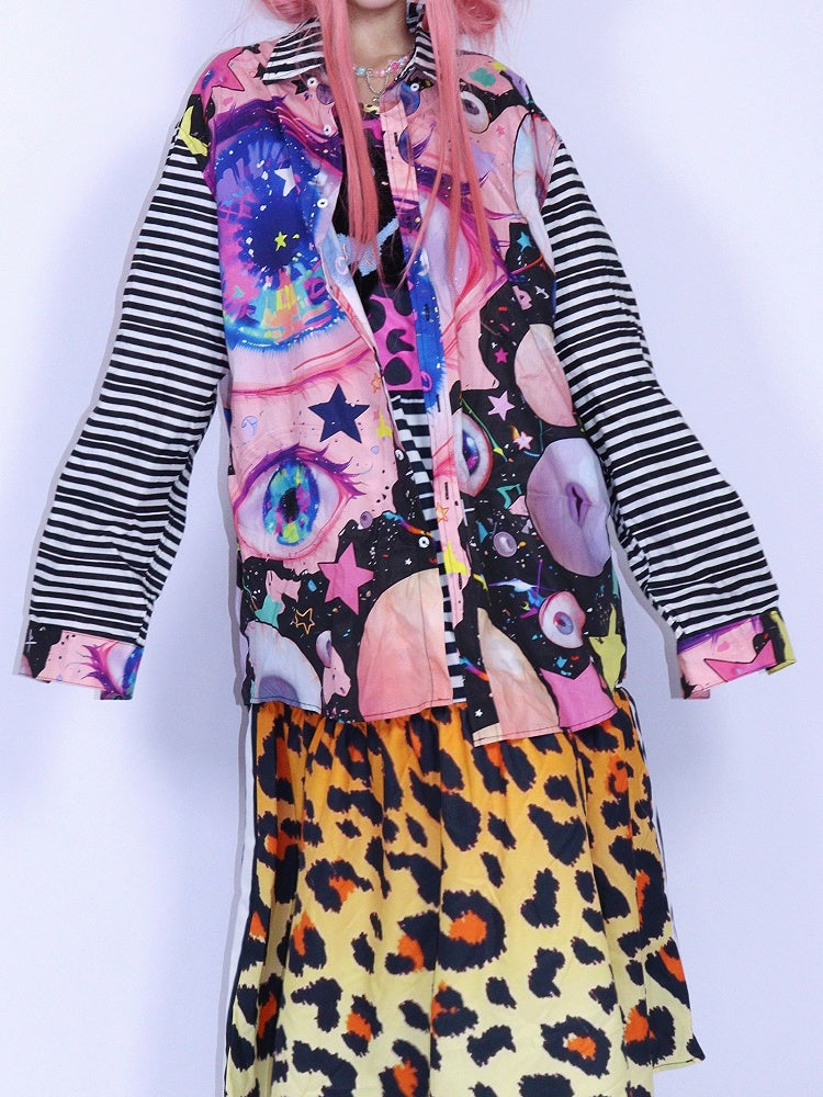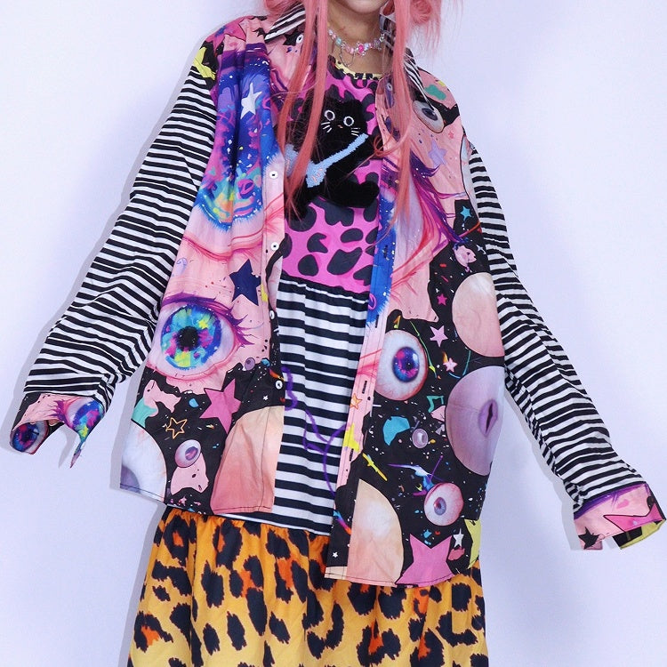 シャツ カワイイ ブラック プリント グロ ストライプ アイズ 袖 オーバーサイズ