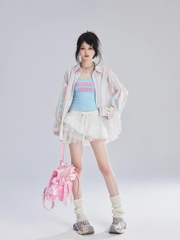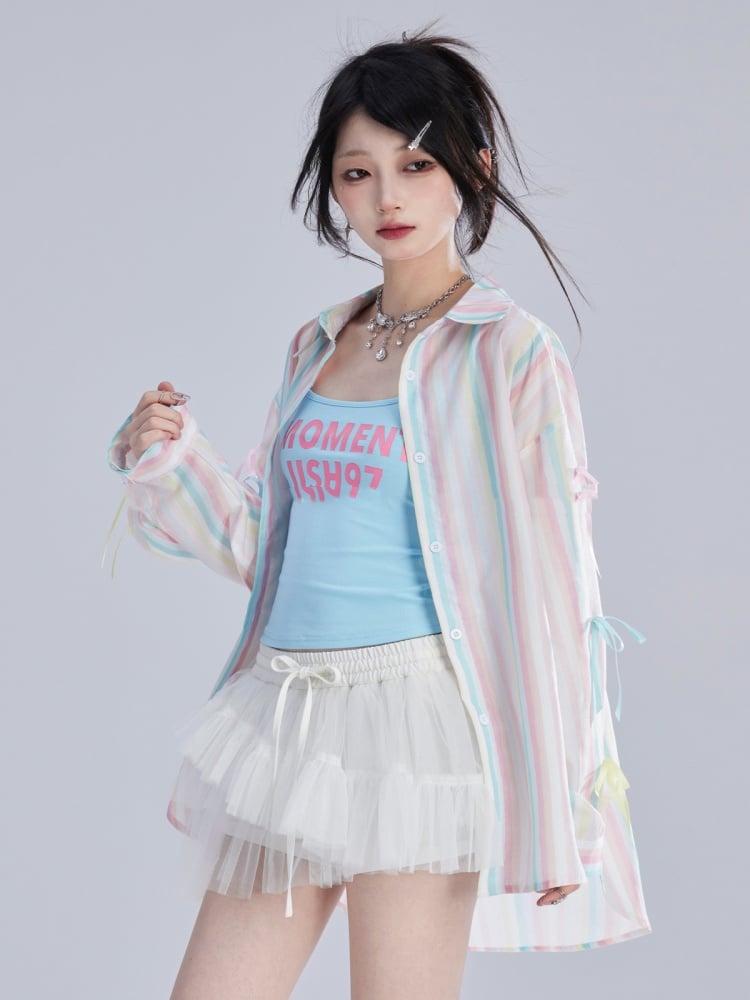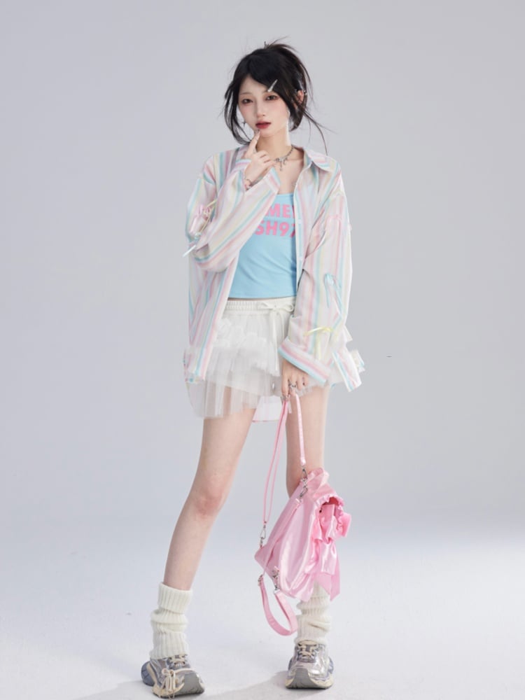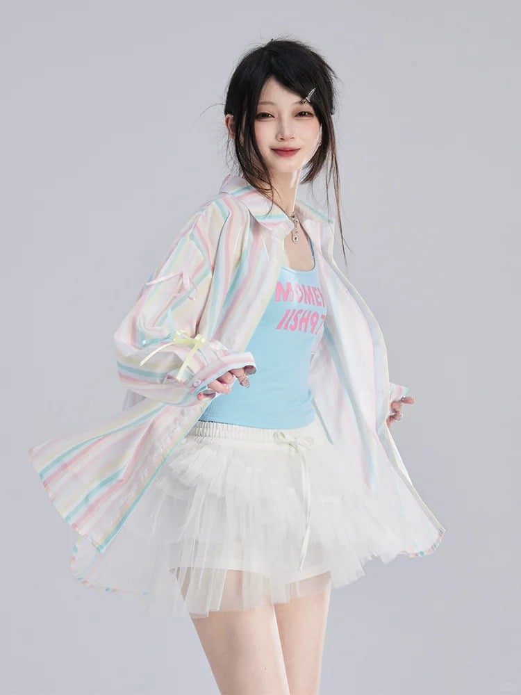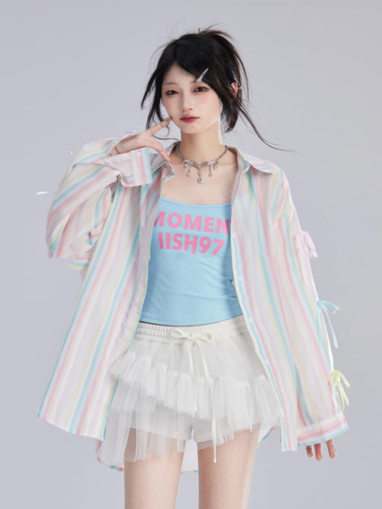 シャツ ゆったり カラフル 装飾 ストライプ 蝶結び 袖
