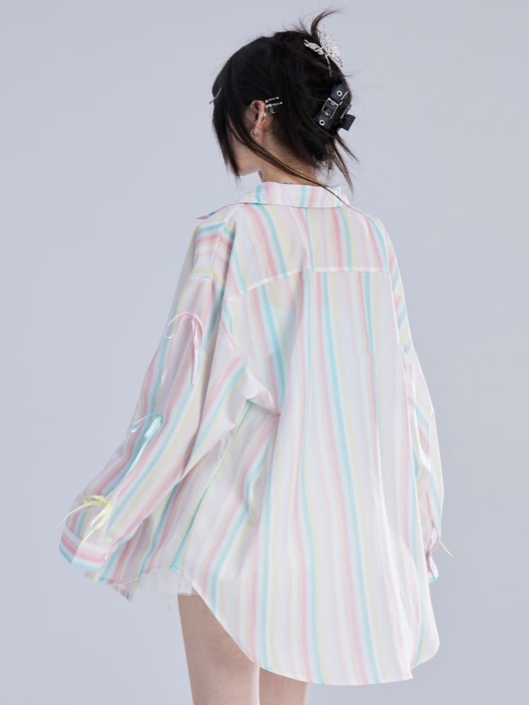 カラフルなストライプと蝶結び、袖の装飾が施されたゆったりとしたシャツ