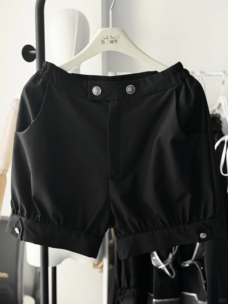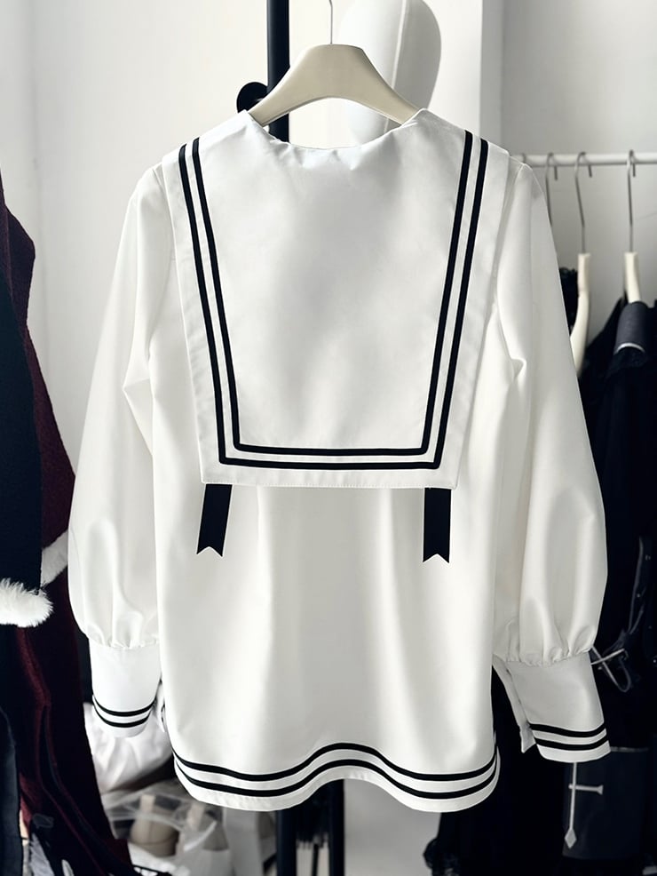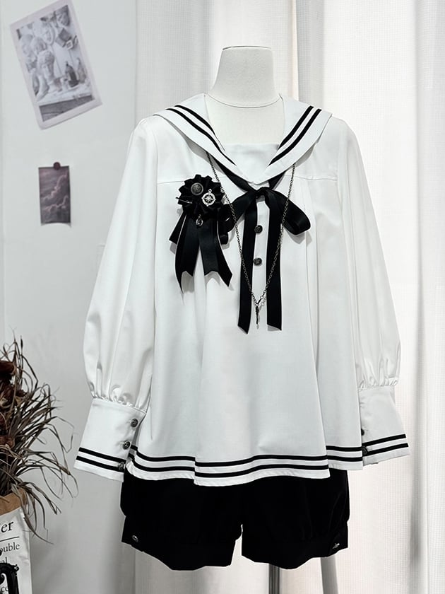 白いセーラーカラーの長袖シャツと黒いショートパンツ
