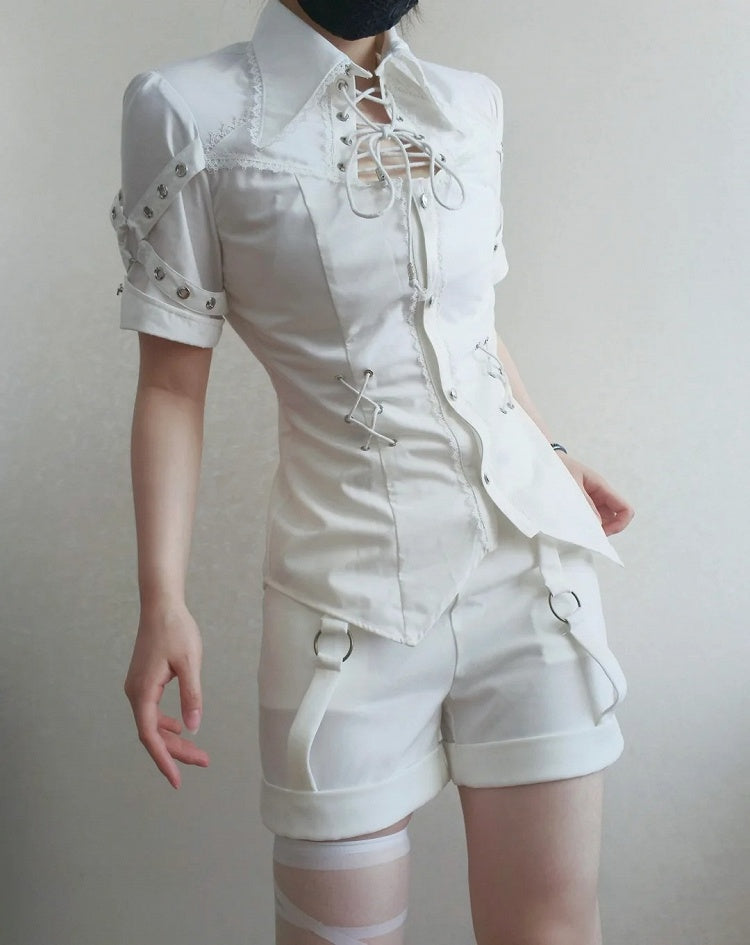 ホワイト王子ロリータファッションレースアップネックライン半袖シャツ