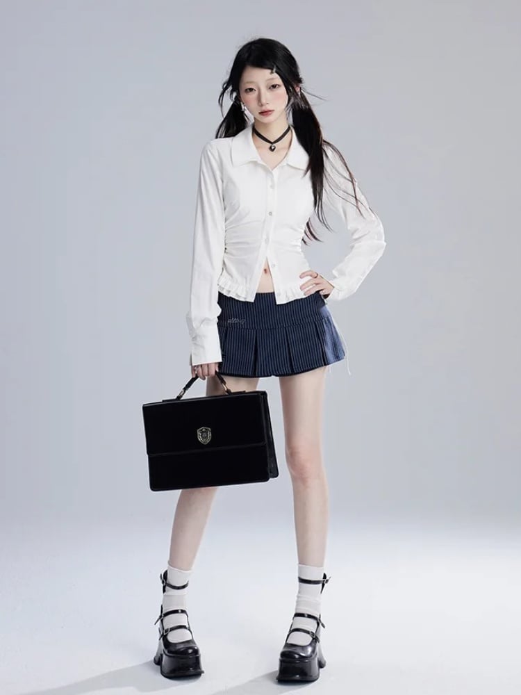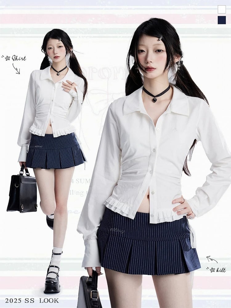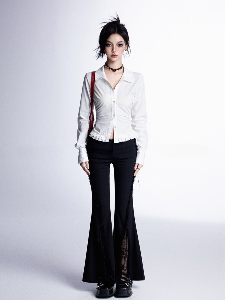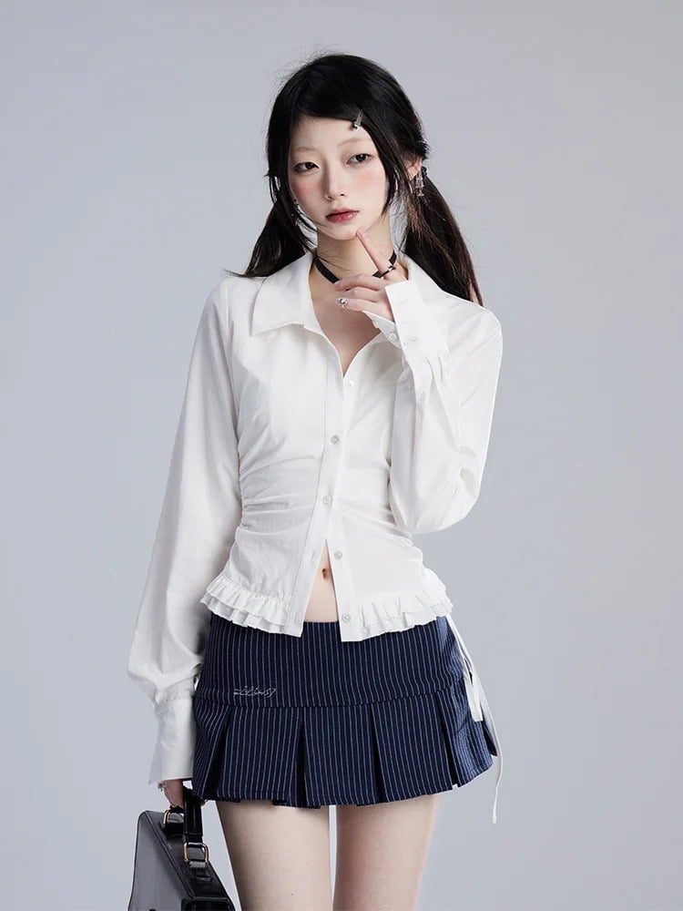 ホワイトのルーシュウエスト、フリルヘム、スリムフィットシャツ